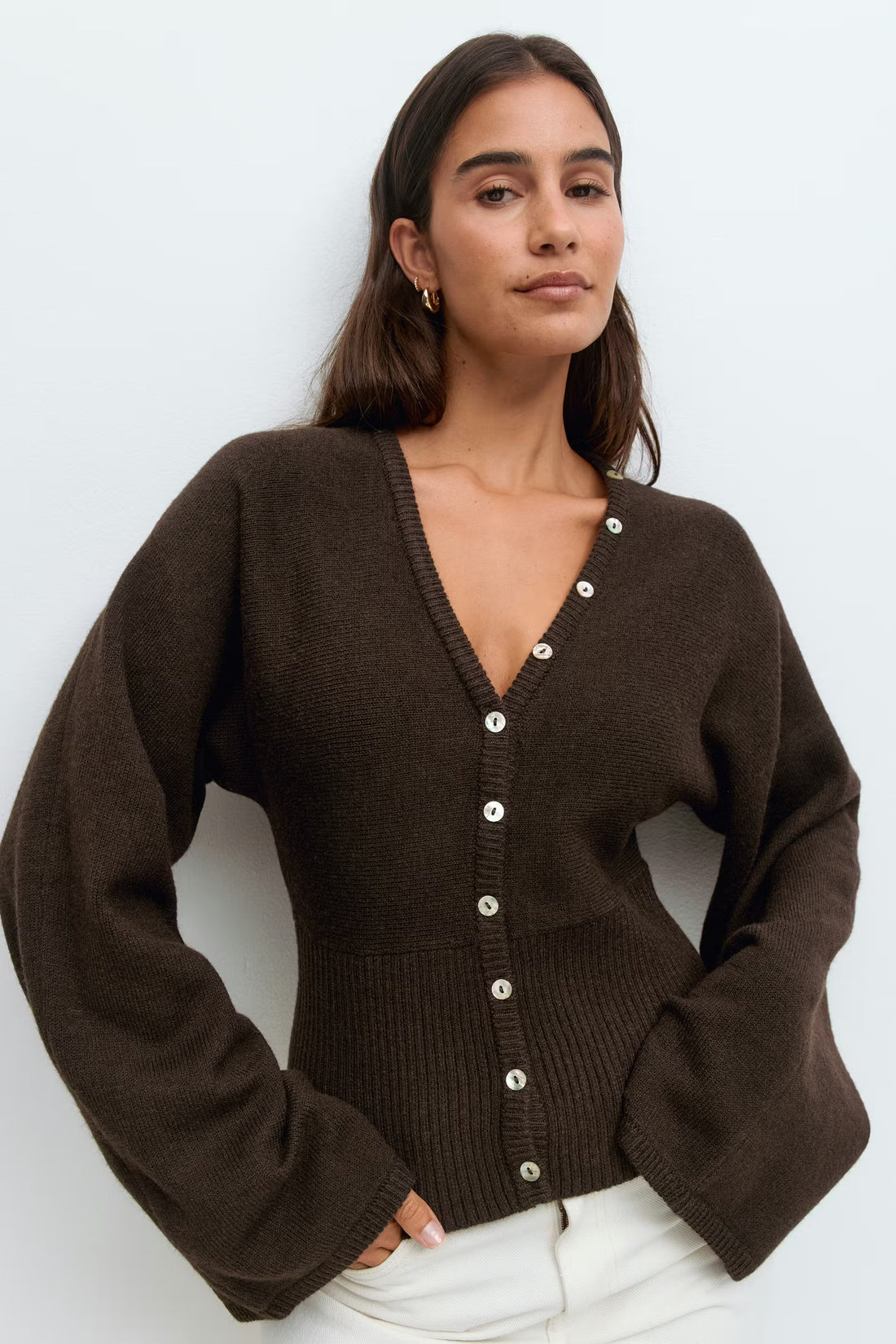 Cardigan ajusté avec col en V. Le cardigan est brun et a des manches longues...