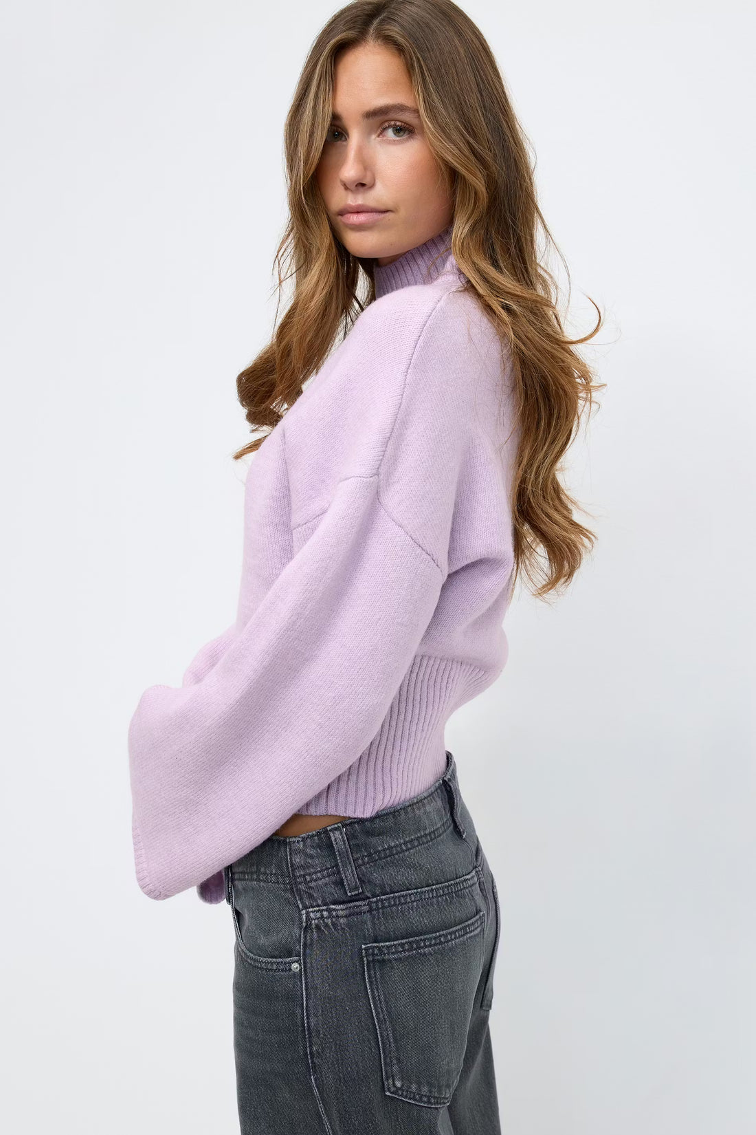 Pull tricoté avec col haut. Le sweat est violet et a taille courte. Il a...