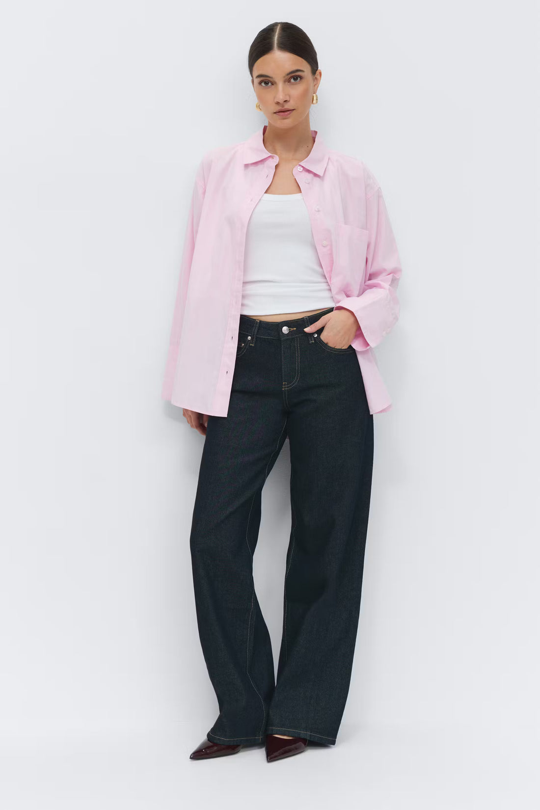 Jean large avec taille basse. Le jean est bleu et a une jambe large avec...