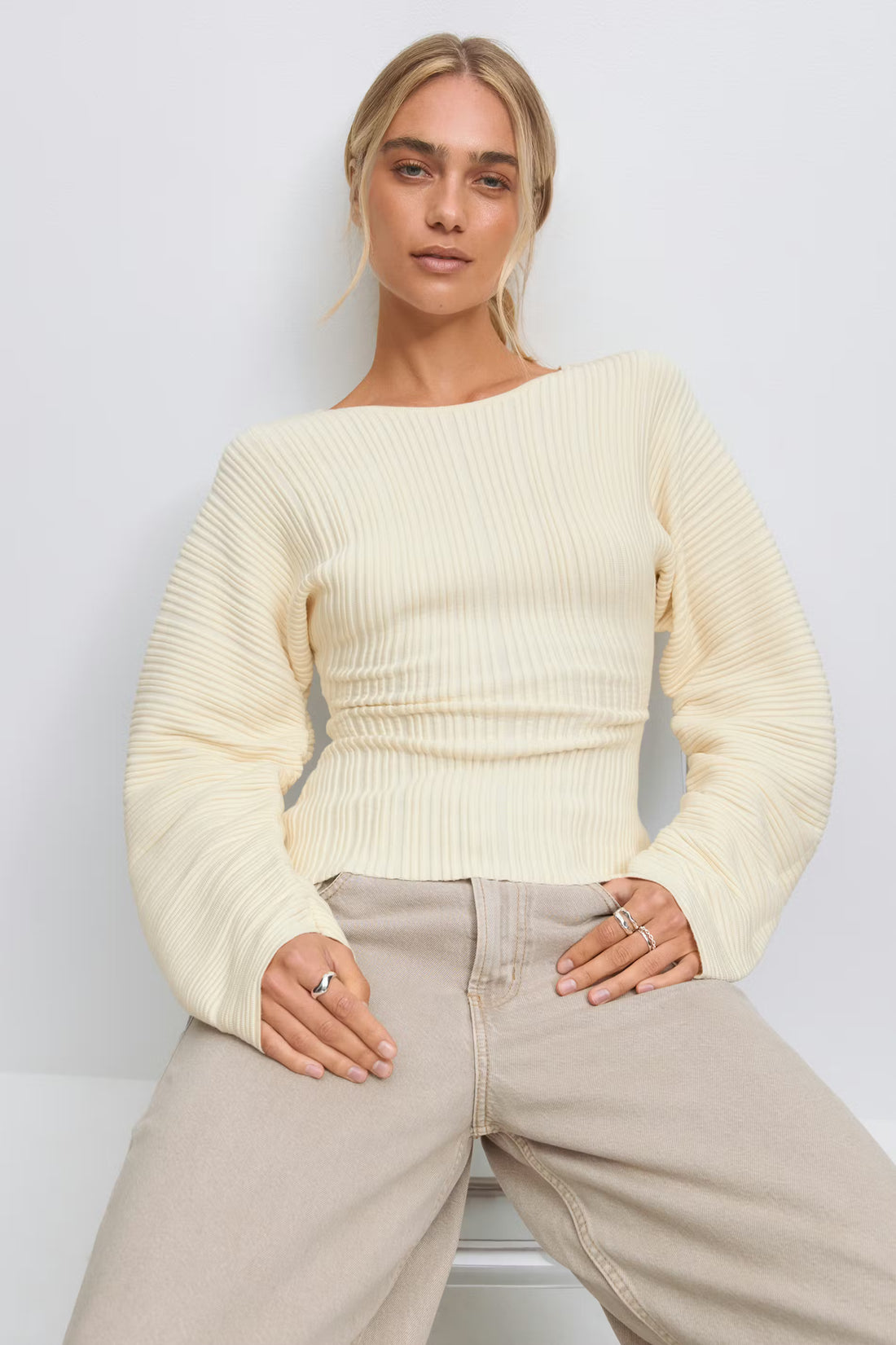 Top tricoté avec manche longue et arrondie. Le top est crème et a une matière...