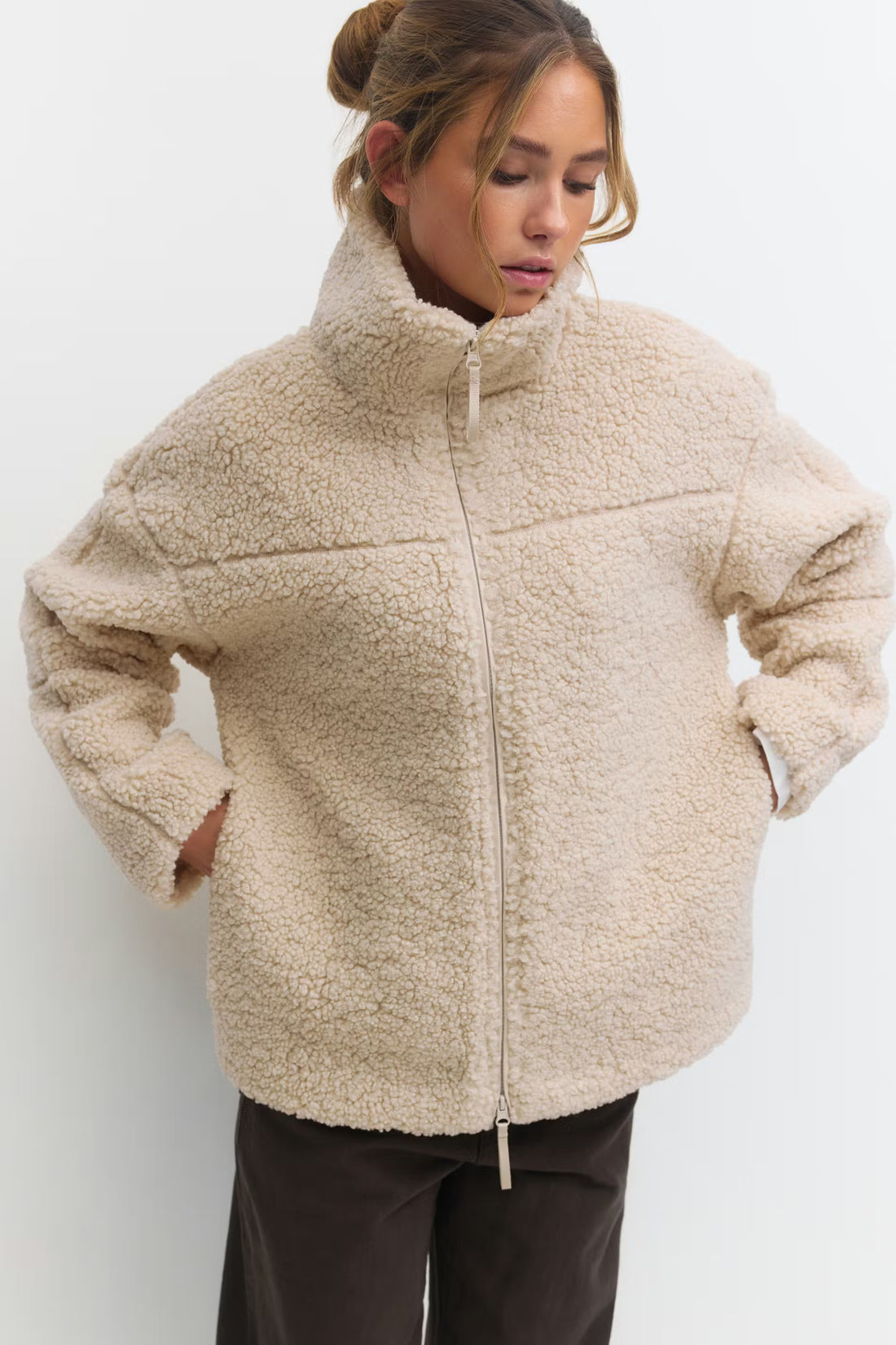 Blouson teddy avec coupe oversize. Le blouson teddy est beige et a col haut. Il...
