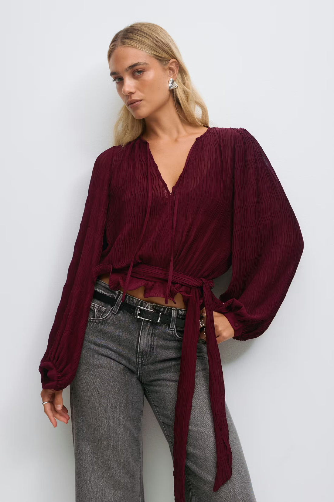 Chemisier à manches longues avec encolure en V. Le chemisier est rouge sombre et a...