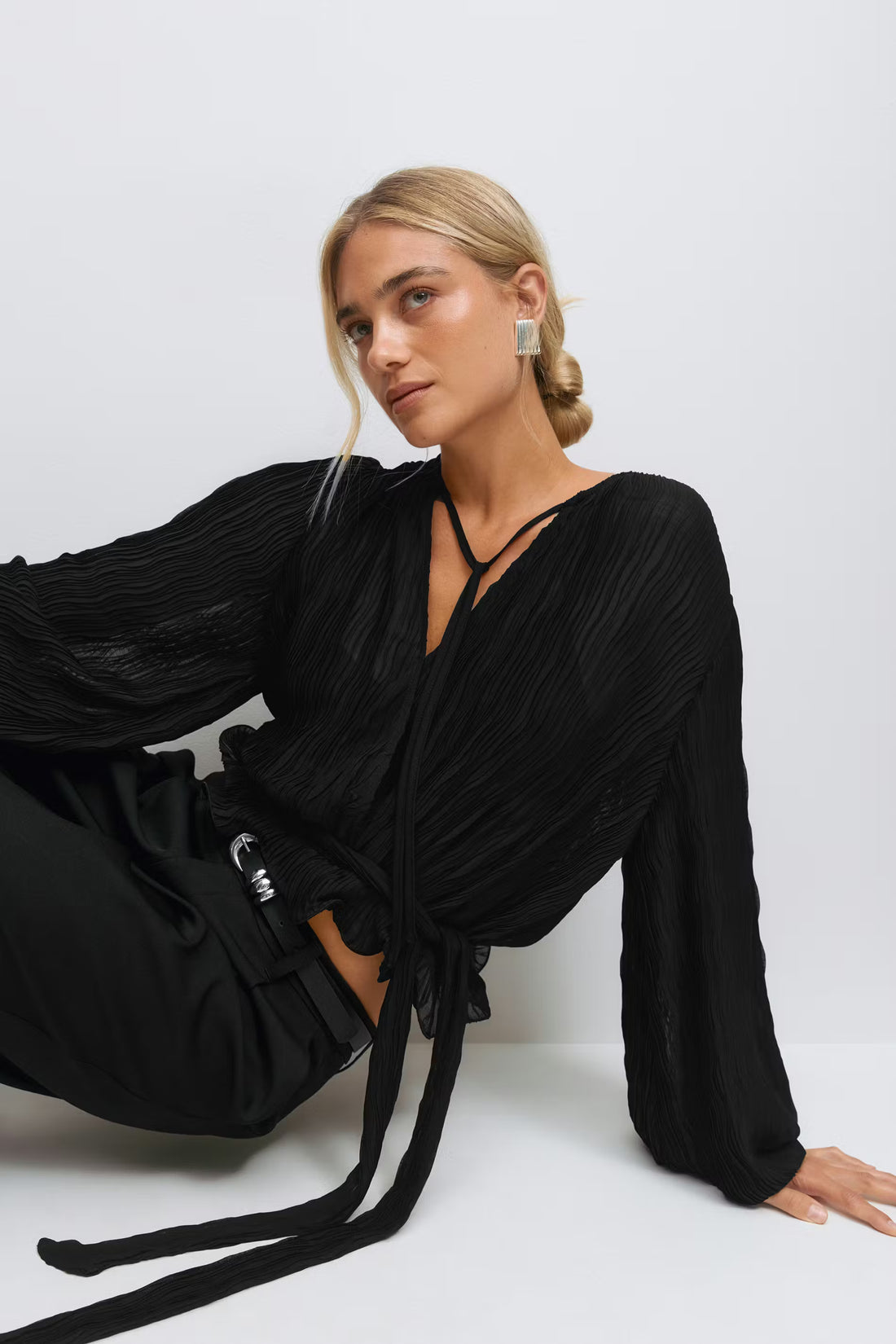Chemisier à manches longues avec encolure en V. Le chemisier est noir et a une...