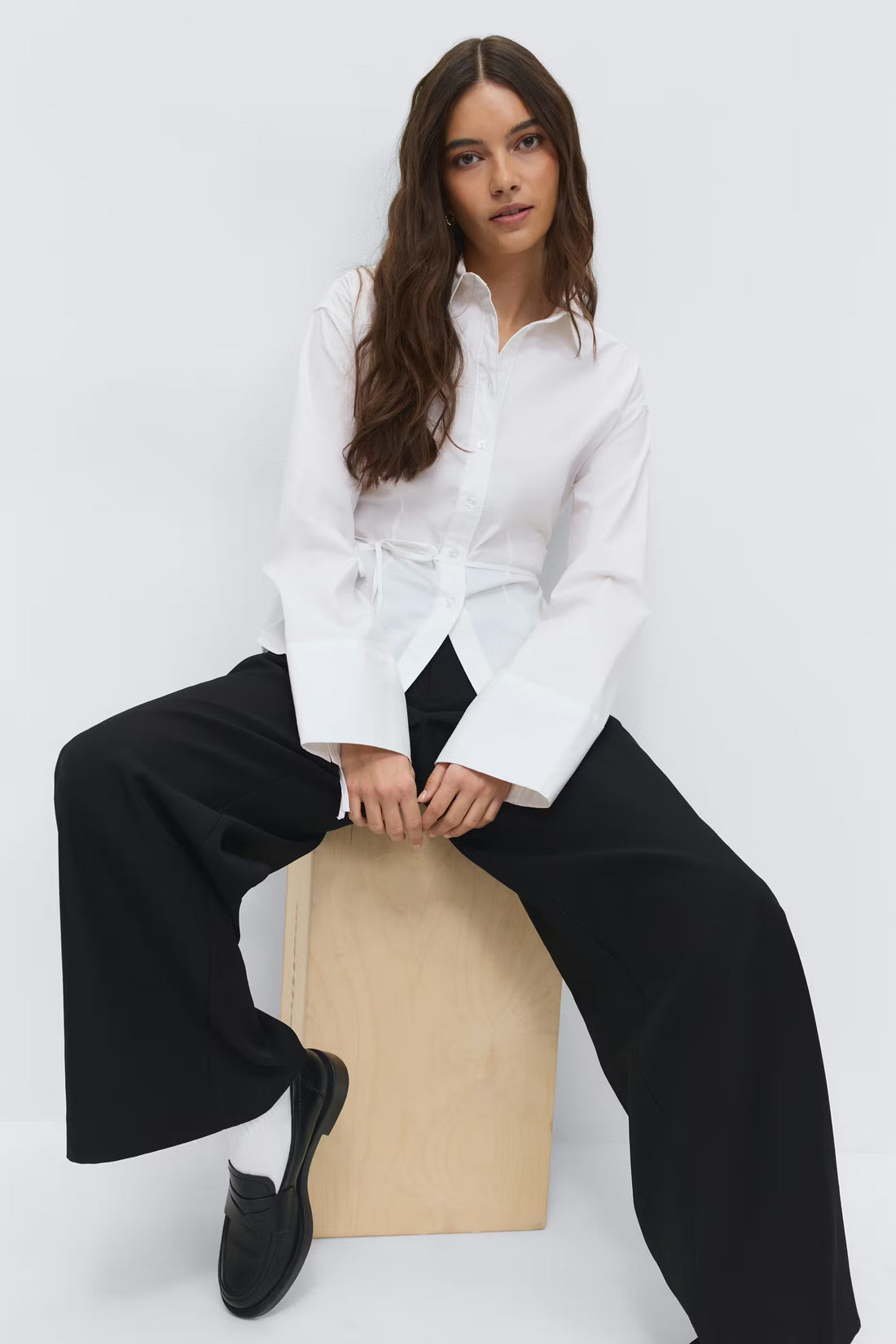 Chemise ajustée avec liens à la taille. La chemise est blanche et a fermeture à...