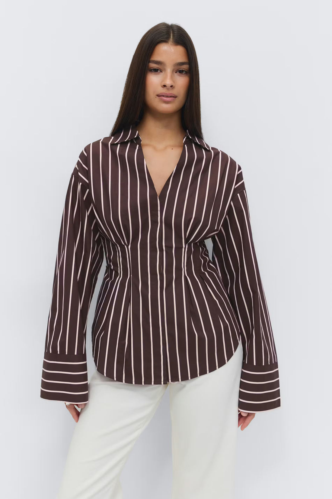 Chemise rayée avec manche longue. La chemise est brune et ajustée et a des boutons...