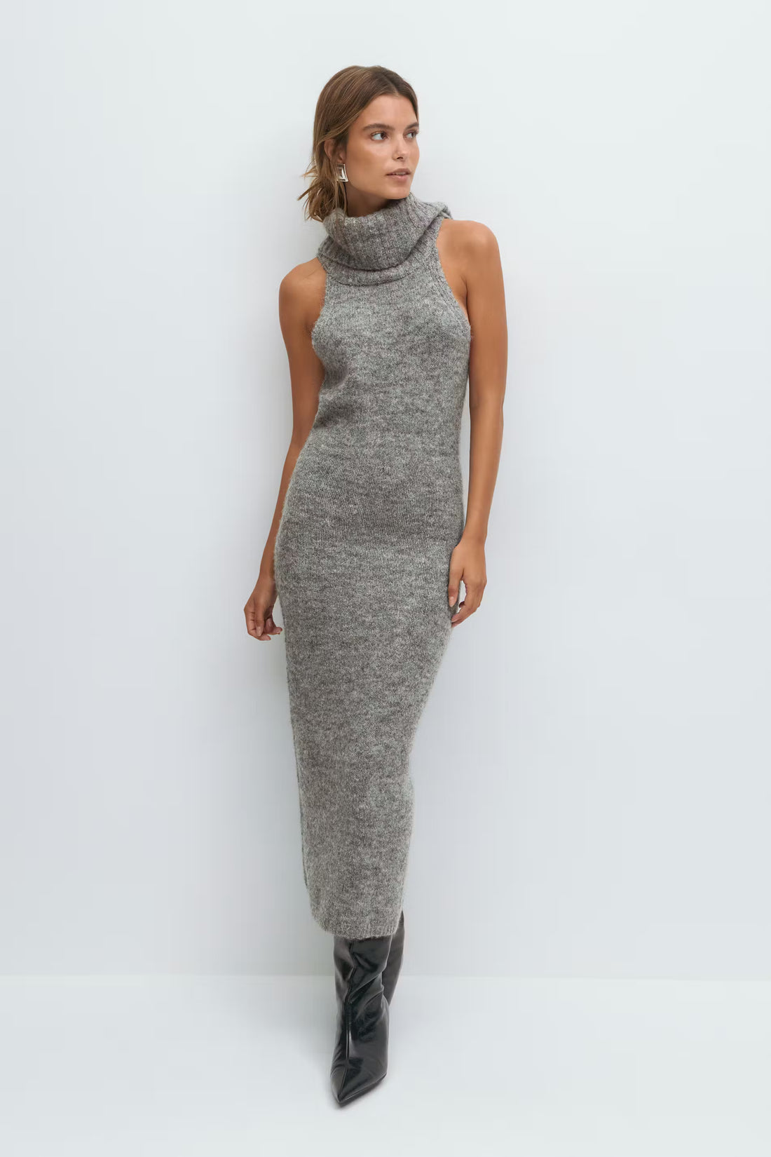 Robe en maille sans manches avec col roulé. La robe est grise et a coupe...