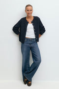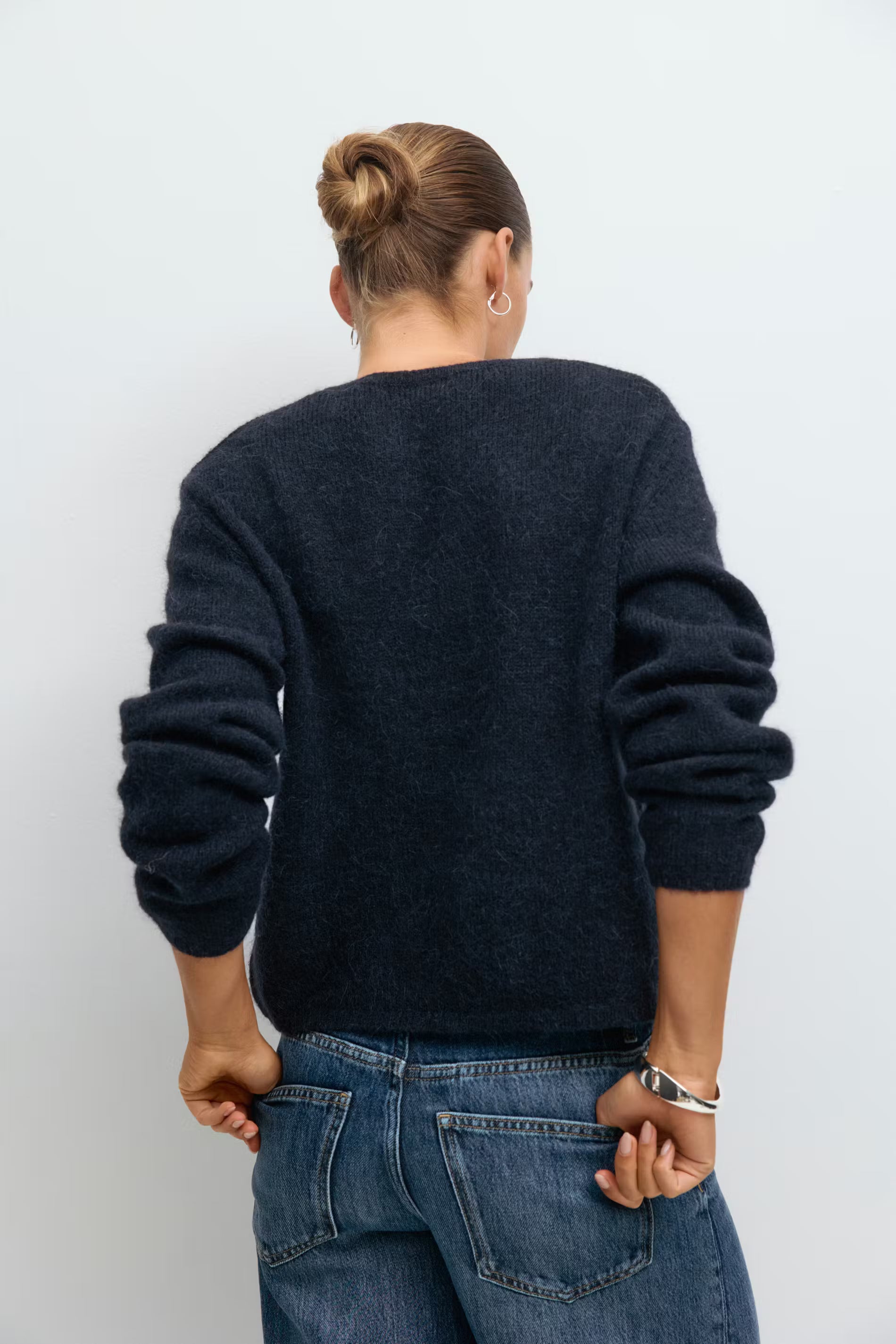 Cardigan tricoté en alpaga mélangé avec boutons à l'avant. Le gilet est bleu marine et a style ample. Il a col arrondi et des manches longues.