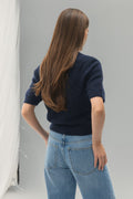 Pull tricoté à manches courtes avec coupe oversize. Le sweat est bleu marine et a qualité en tricot fin. Il a longueur normale et tricot à côtes à l'extrémité des manches et en bas.