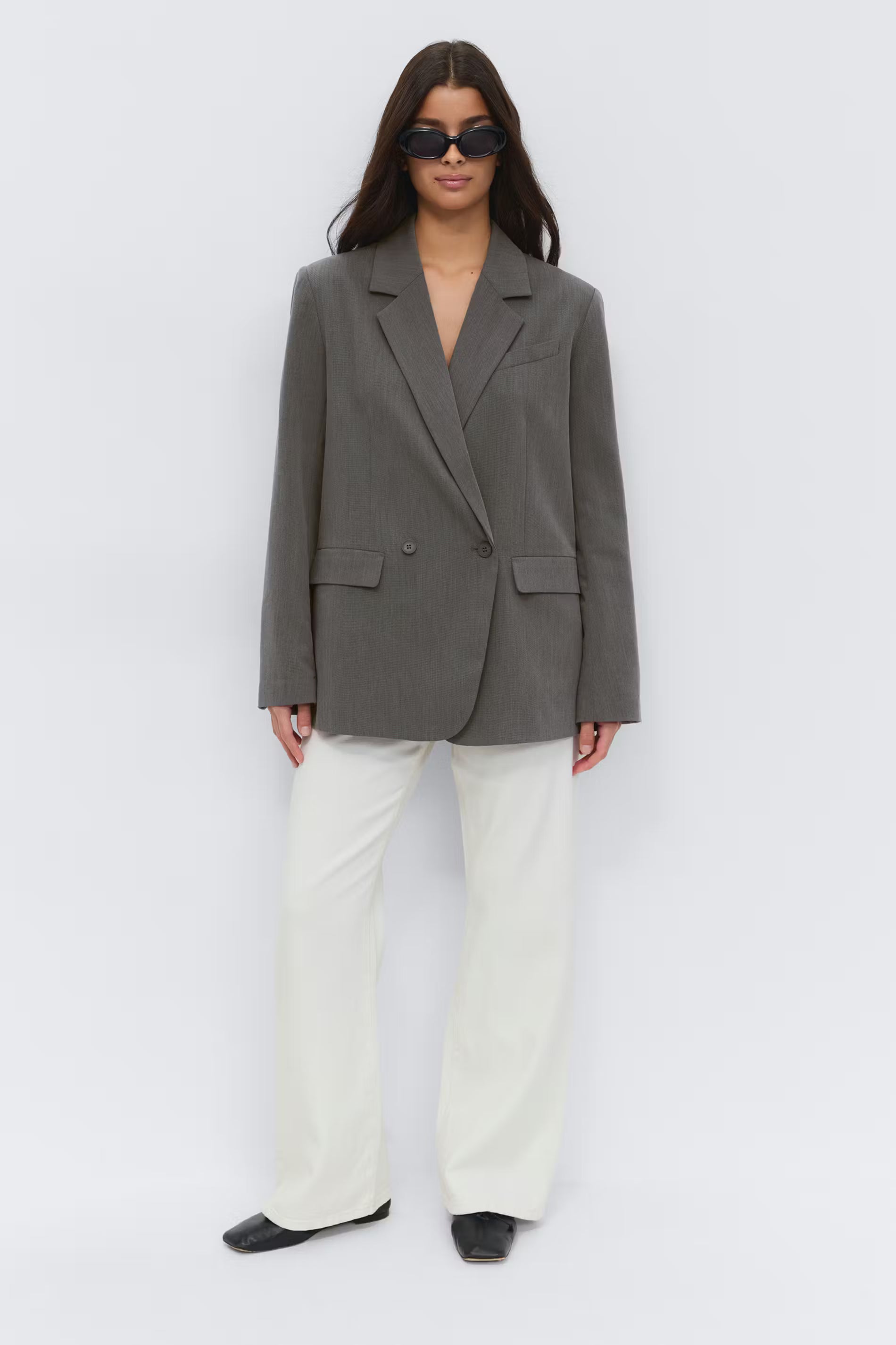 Veste de costume oversize avec longue fente dans le dos. La veste est grise et a des poches à rabat sur les côtés. Elle a fermeture à boutons à l'avant, poche poitrine, col avec revers, manche longue et fente aux extrémités des manches.