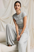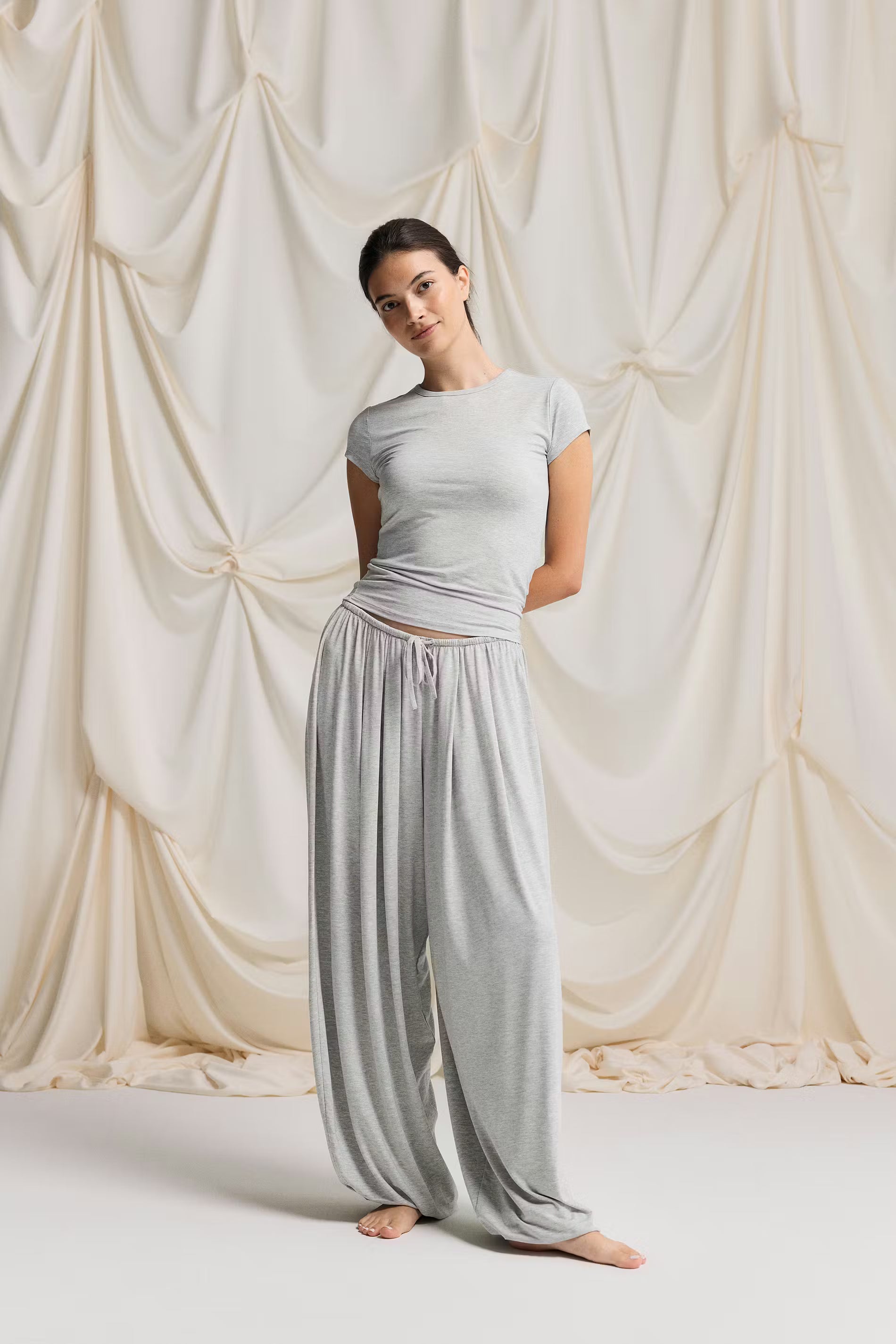 Pantalon ballons en modal avec coupe oversize. Les pantalon ballons sont gris et ont matière douce. Ils ont ajustable à l'avant, taille mi-haute avec élastique, entrejambe tombant et élastique au bout des jambes.