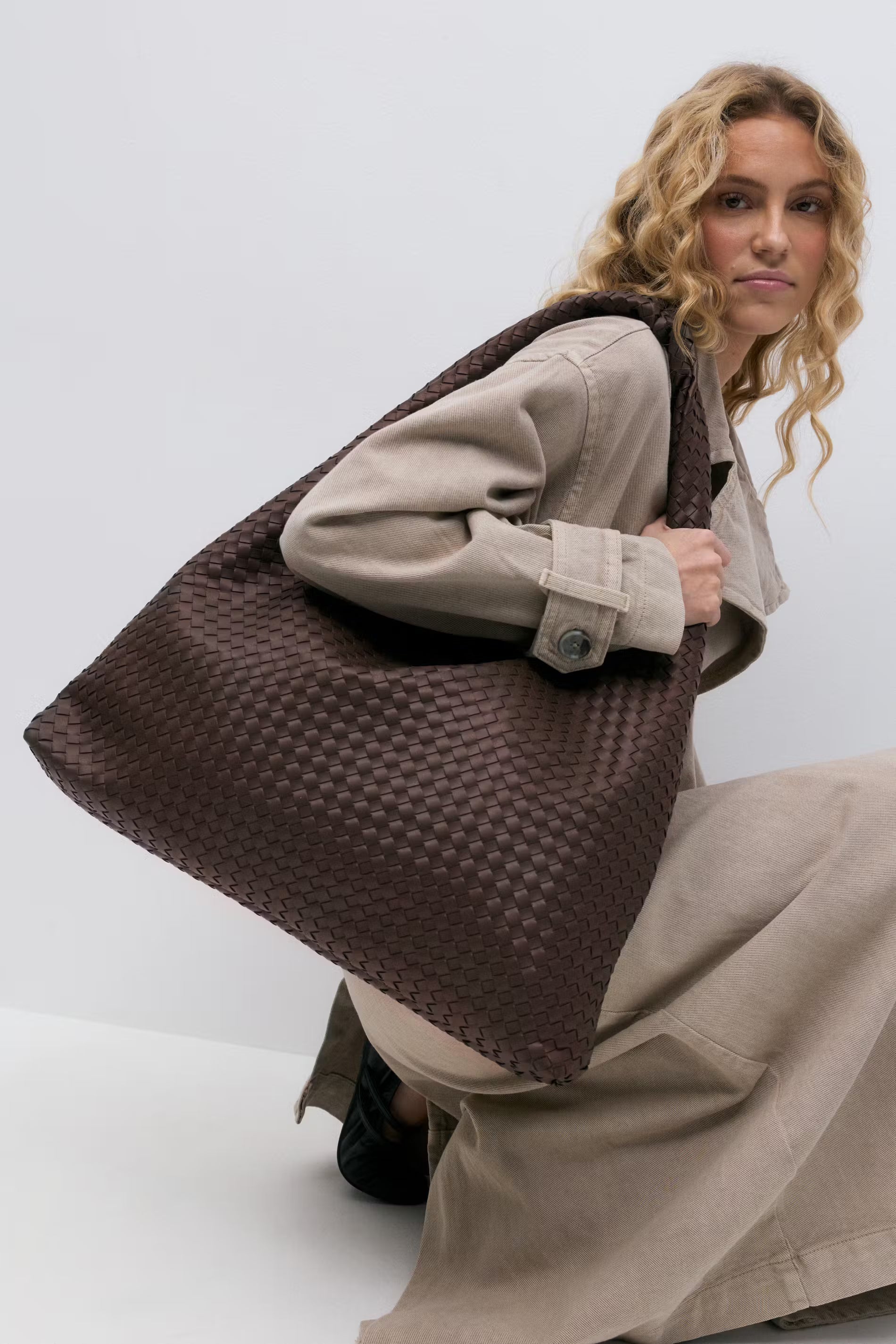 Sac tressé avec poignée torsadée. Le sac est noir et a compartiment spacieux. Un sac parfait pour tous les jours.