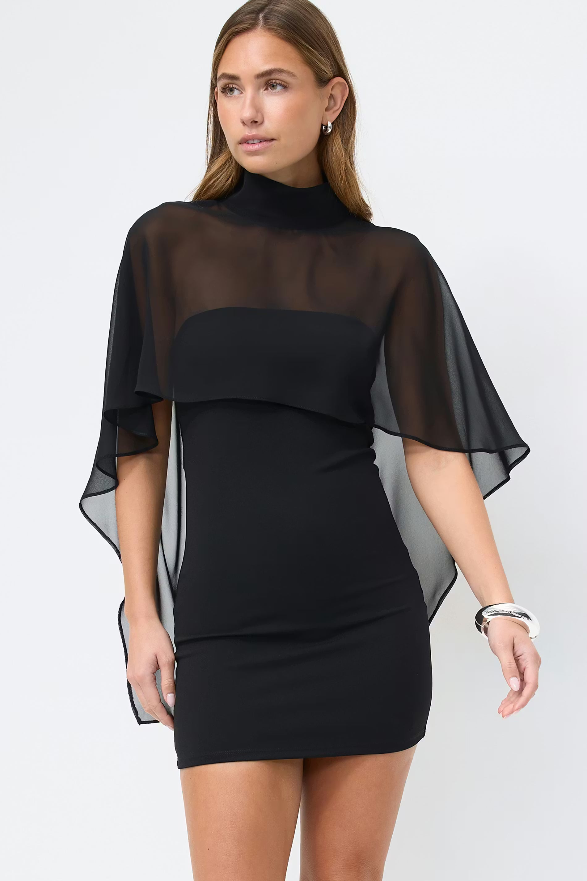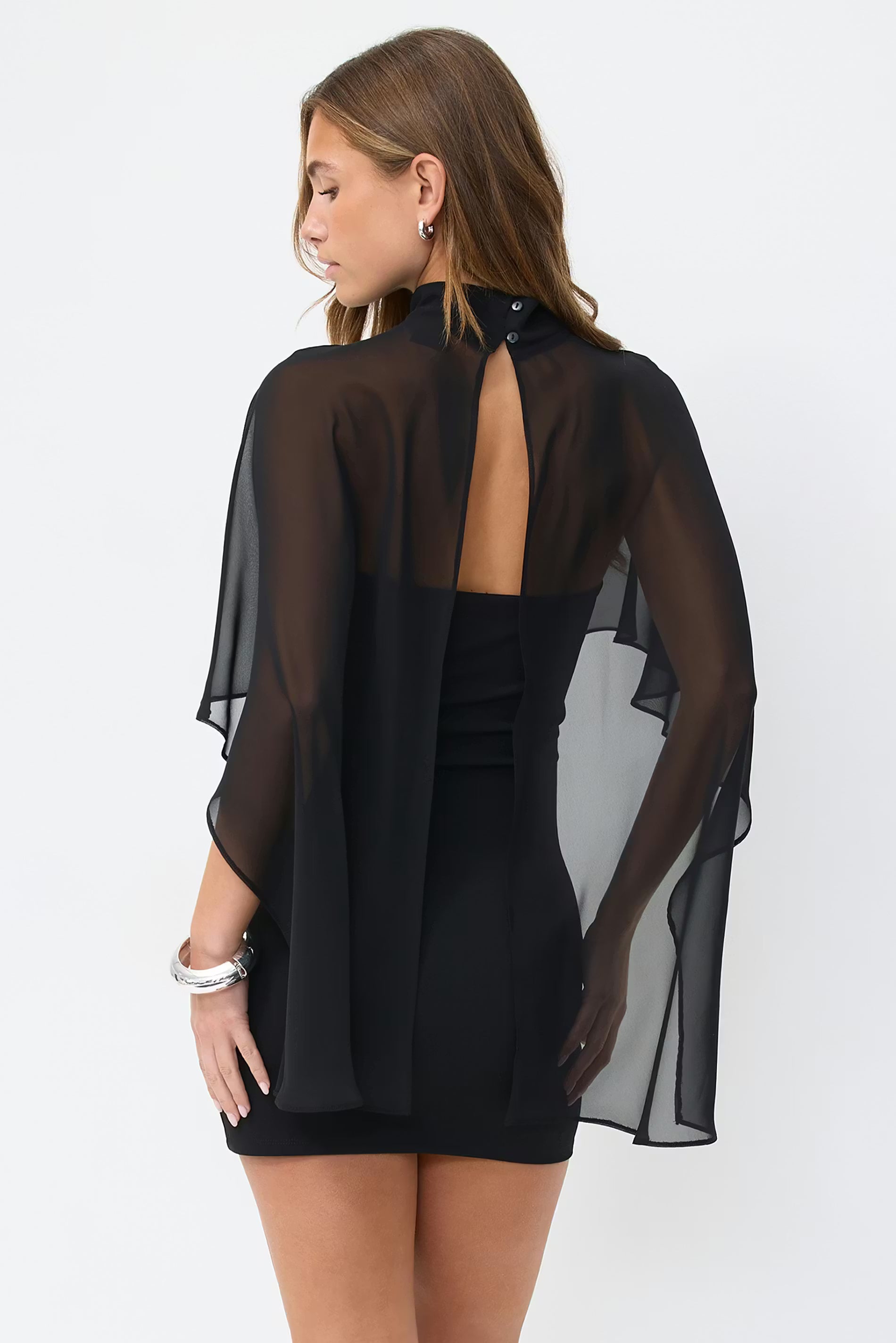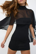 Robe tube courte avec cape transparente. La robe est noire et a coupe près du corps. Elle a col haut et fermeture à boutons au cou.