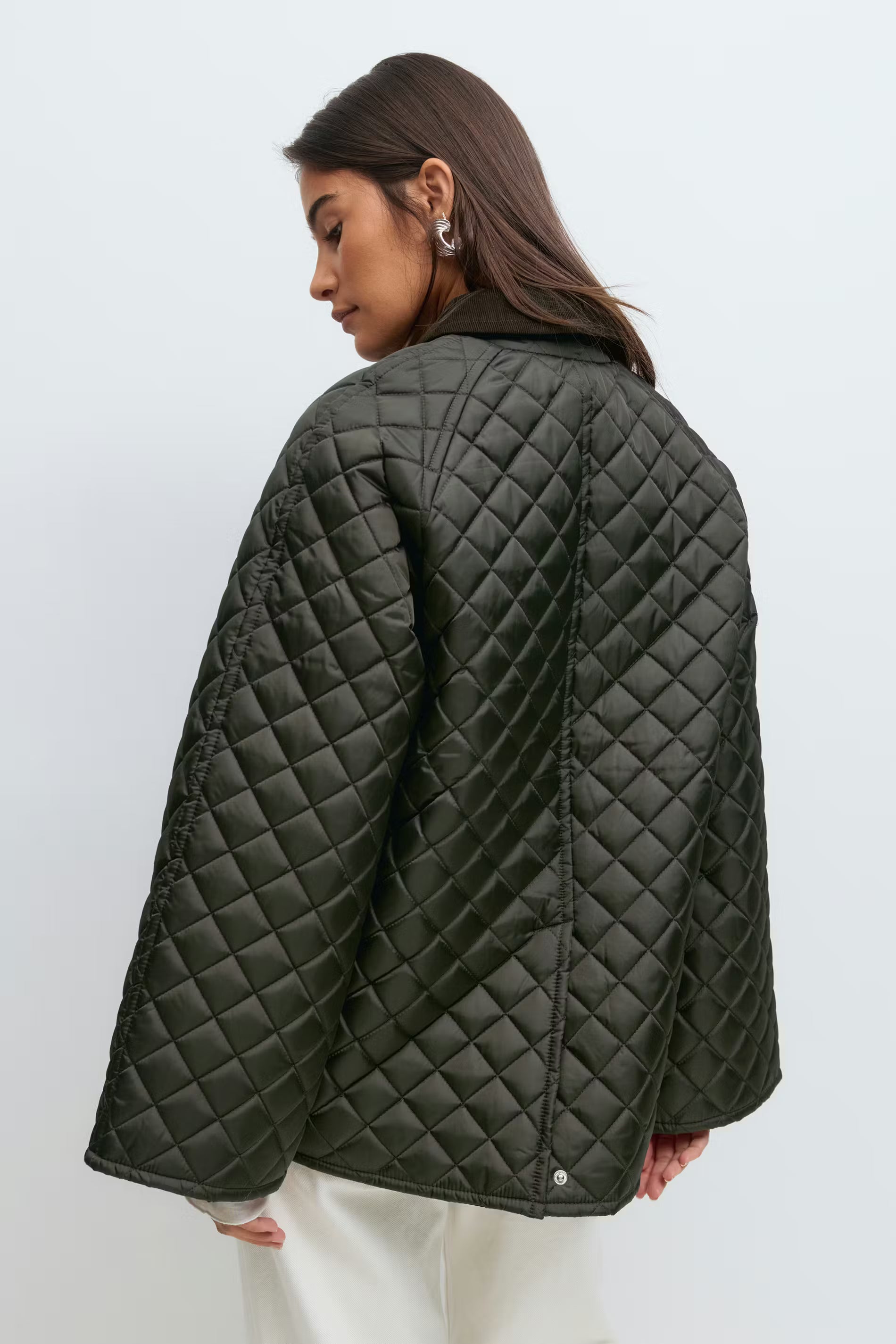 Veste piquée avec col en velours côtelé à nervures. La veste est verte et a des boutons-pression à l'avant. Elle a coupe oversize, des manches raglans, fente avec fermeture à boutons dans le dos et des poches sur les côtés. À doublure.