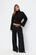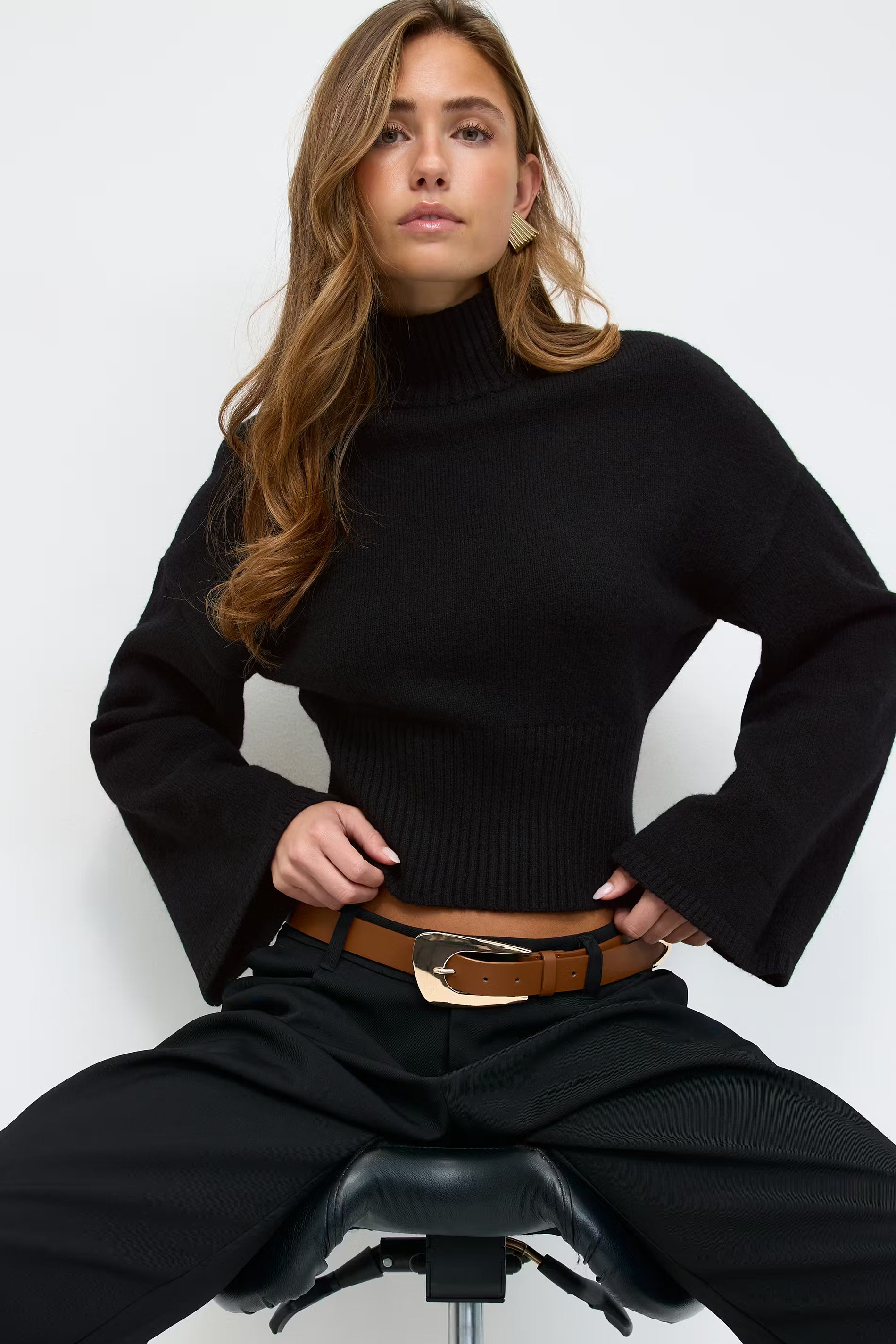 Pull tricoté avec col haut. Le sweat est noir et a taille courte. Il a taille ajustée, des manches longues, des épaules tombantes et machette large à nervures en bas.