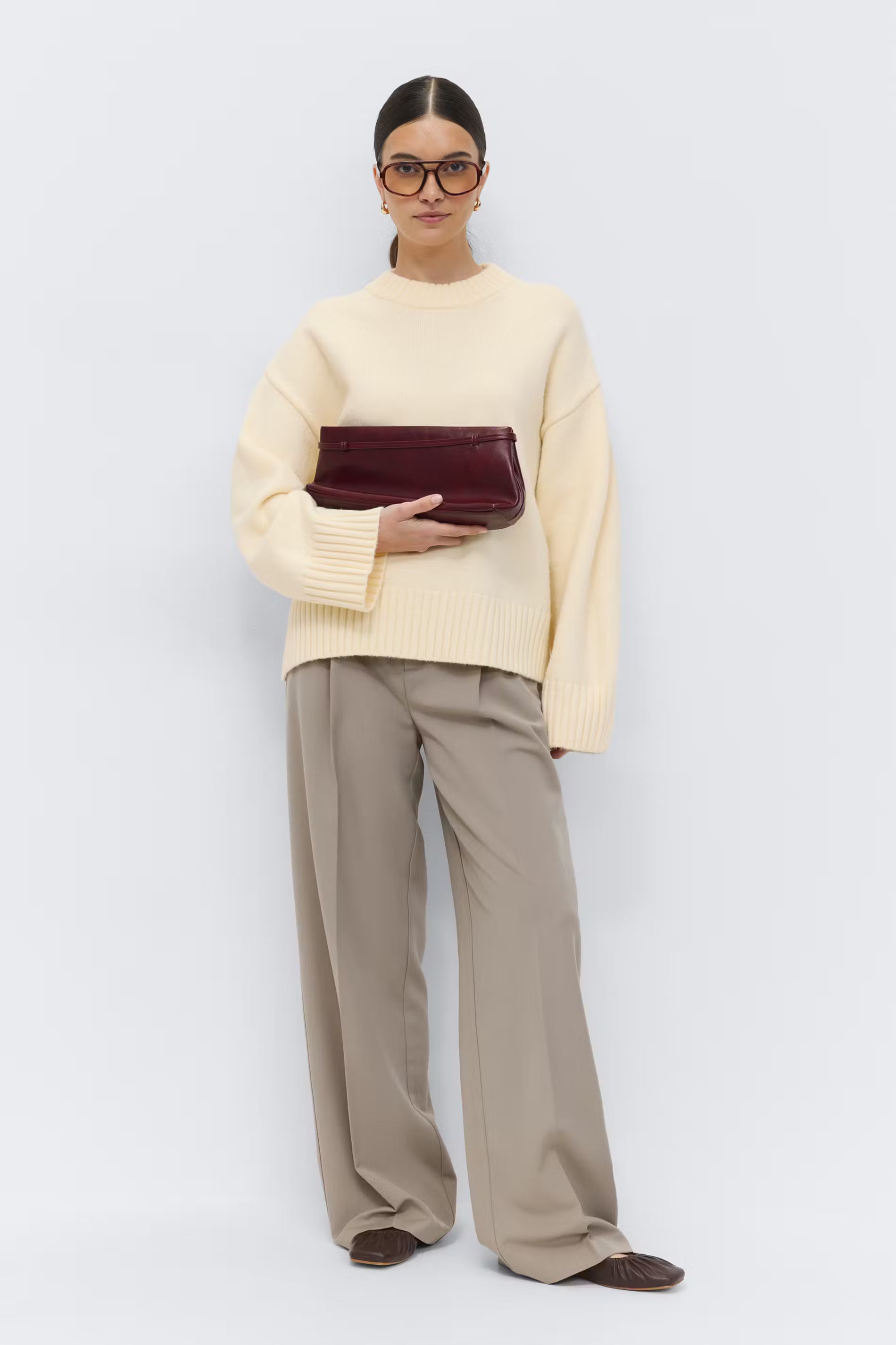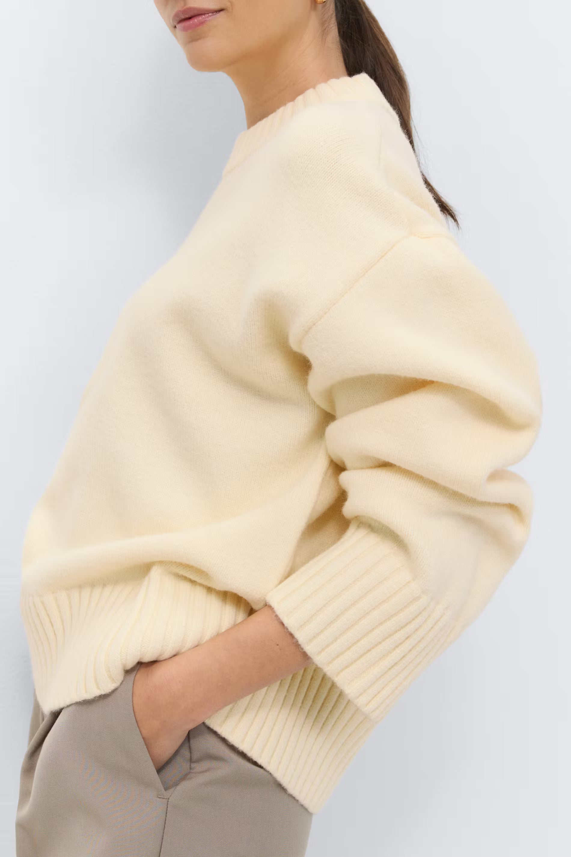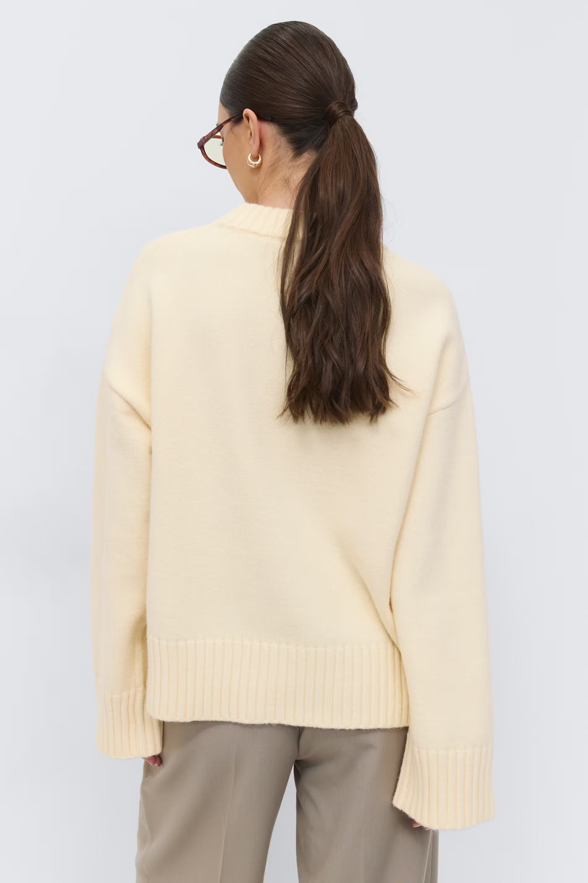 Pull tricoté avec coupe oversize. Le sweat est jaune et a col arrondi. Il a des manches longues, des épaules tombantes et tricot à côtes à l'extrémité des manches et en bas.
