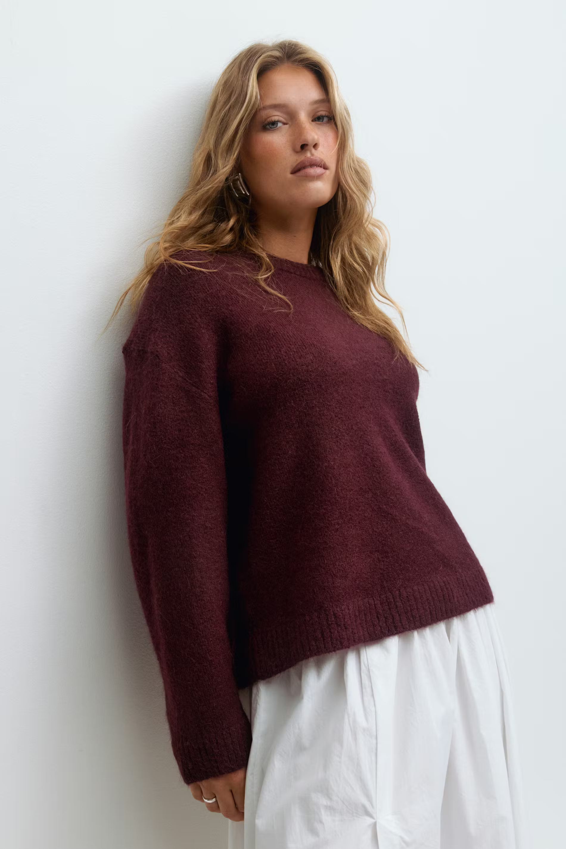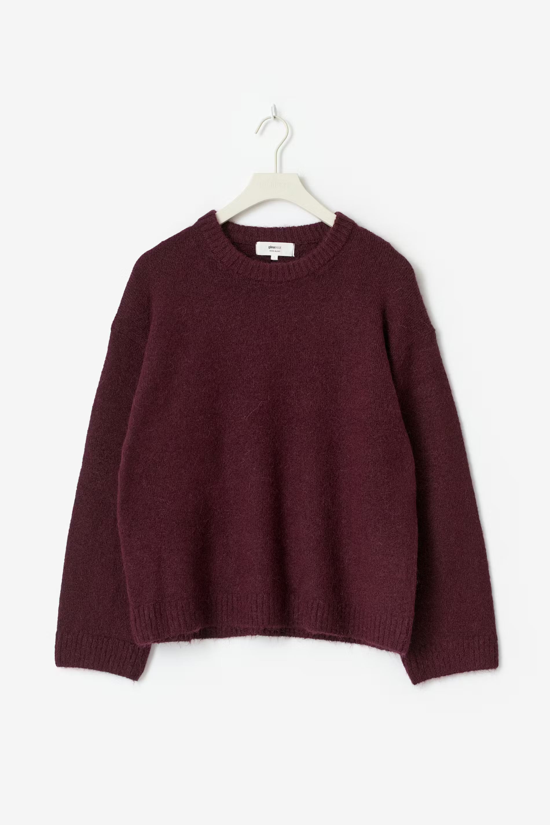 Pull tricoté avec coupe oversize. Le sweat est rouge sombre et a qualité en tricot fin. Il a col arrondi, manche longue, longueur normale et tricot à côtes à l'extrémité des manches et en bas.