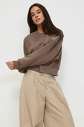 Sweat court avec style ample. Le sweat est brun et a encolure bateau. Il a intérieur brossé doux, des manches longues, des épaules tombantes, des détails de couture décoratifs et revers côtelé aux extrémités des manches et en bas.
