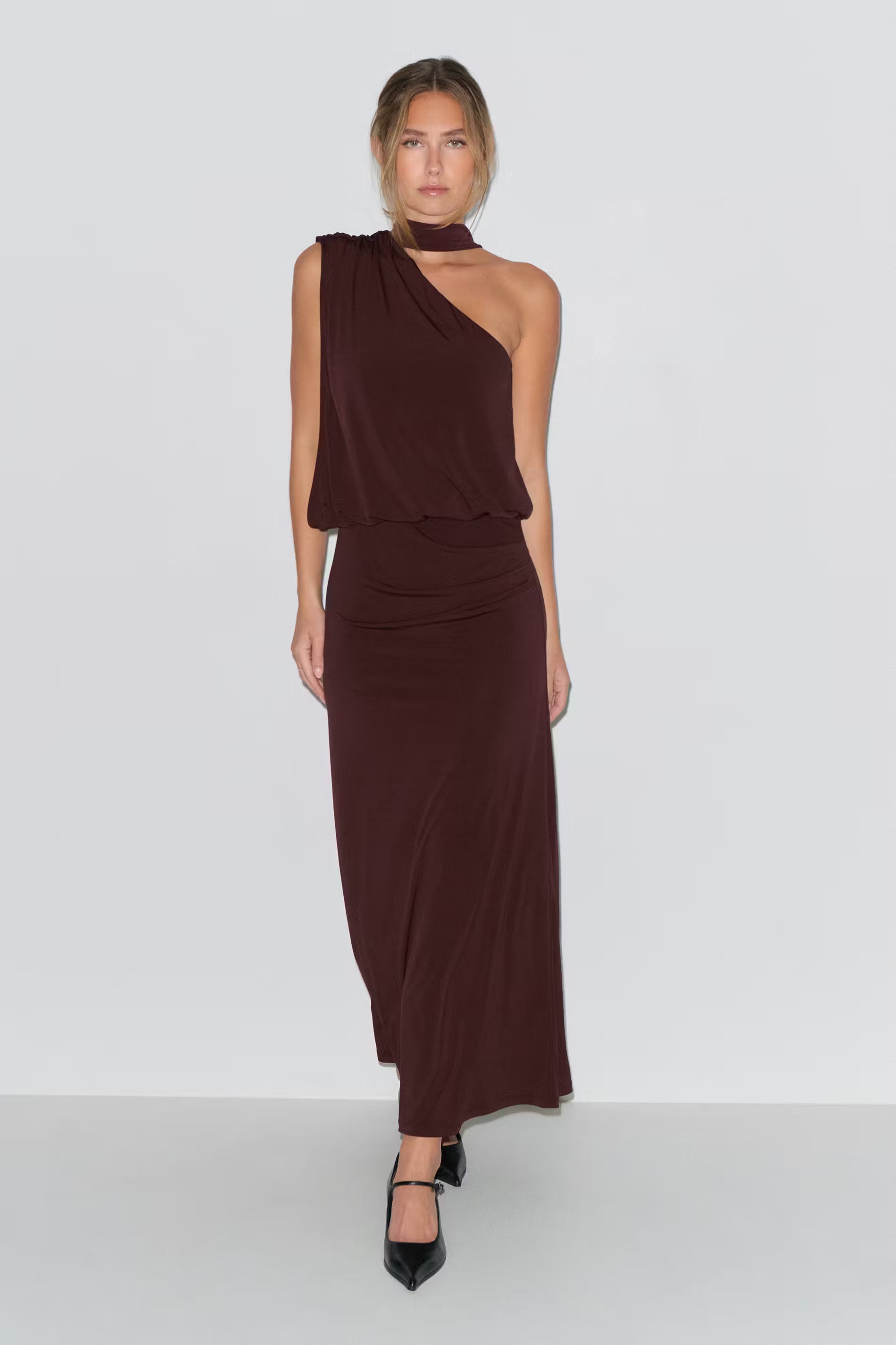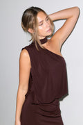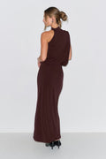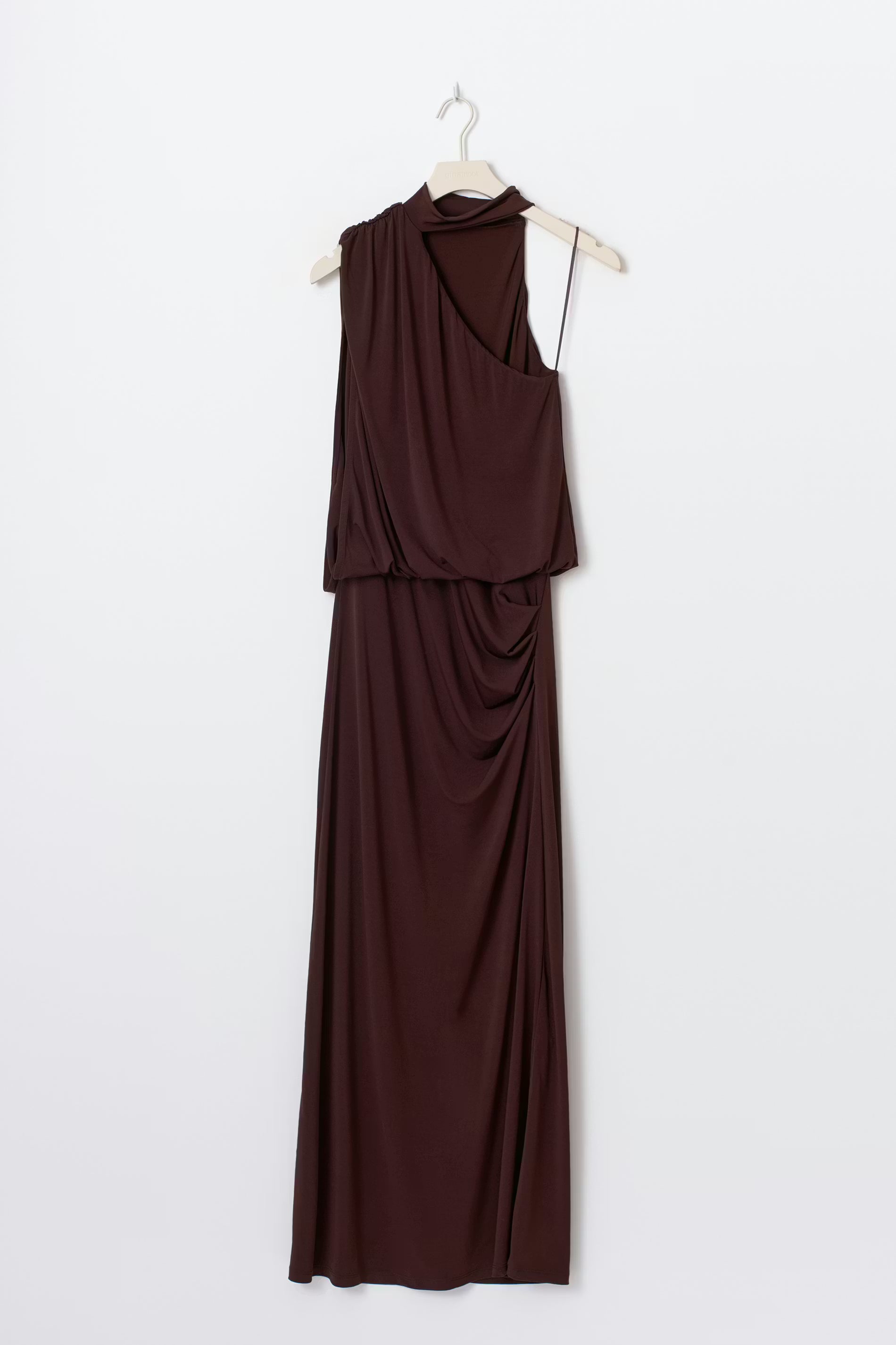 Robe longue sans manches avec rideaux. La robe est en couleur prune et a design à une épaule. Elle a détail d'écharpe au cou, épaule froncée et taille longue.