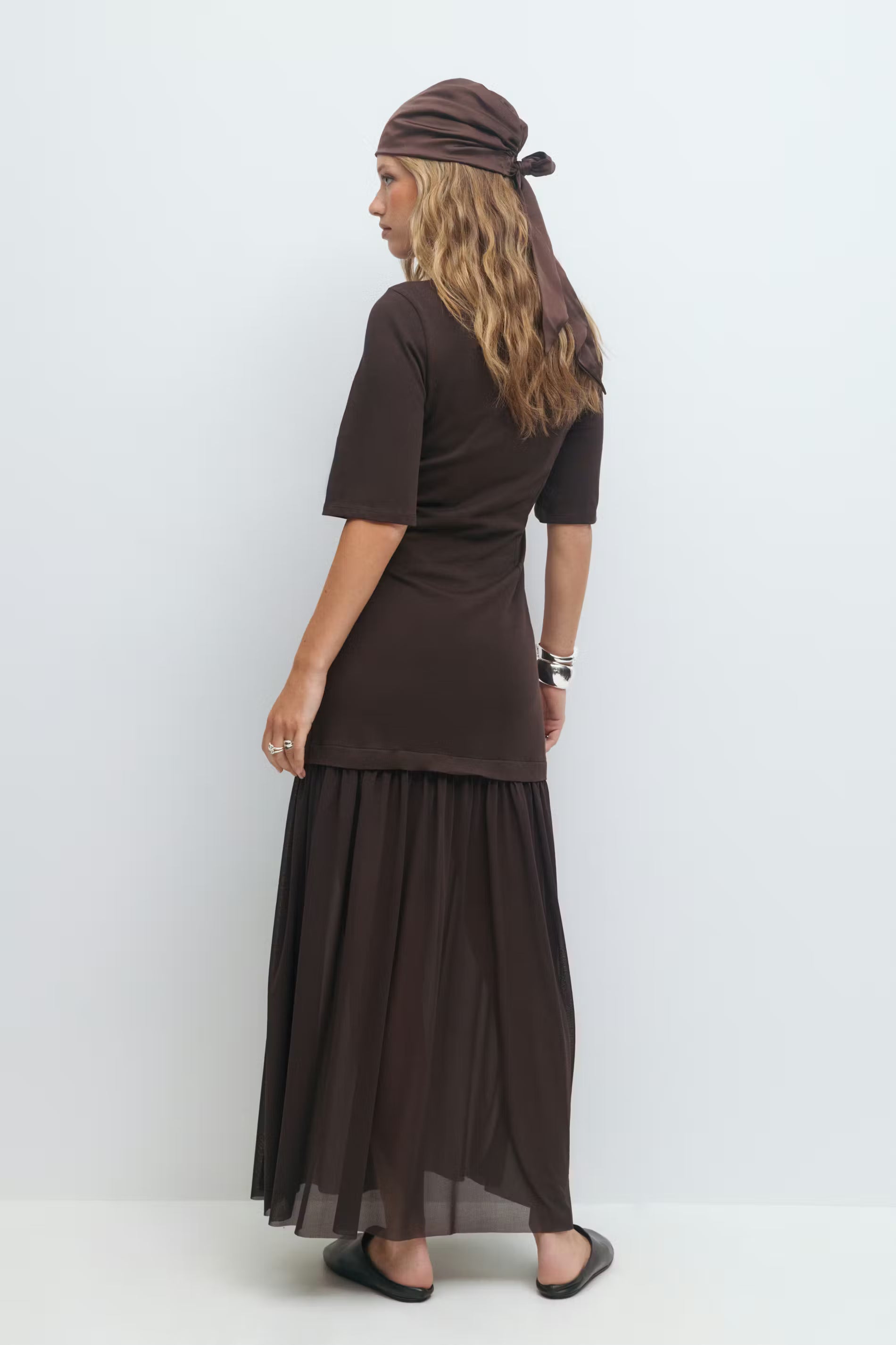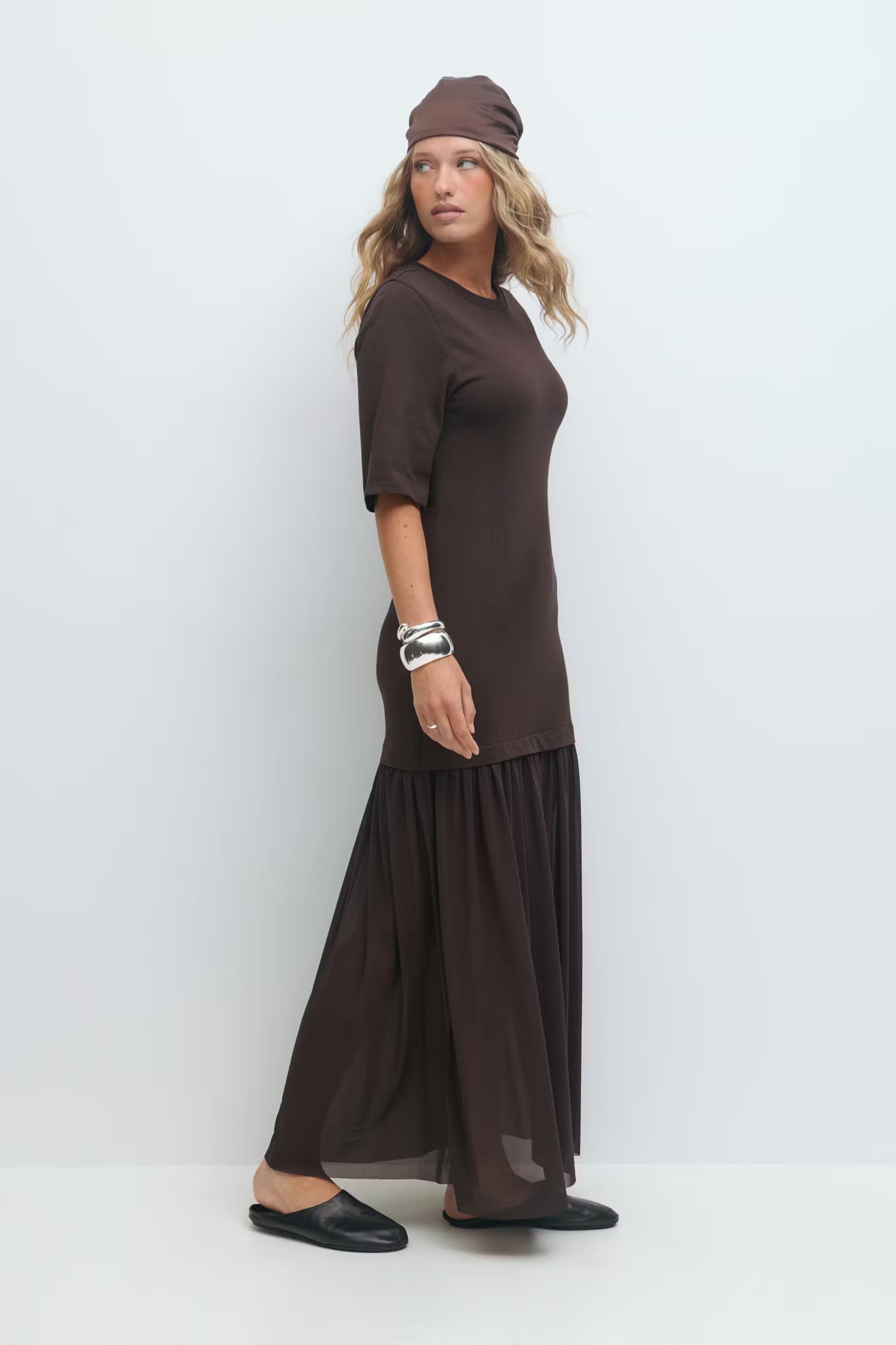 Robe longue à manches courtes avec modèle de t-shirt. La robe est brune et a jupe ruchée en maille avec qualité transparente. Elle a taille tombante, col arrondi et coupe régulière.