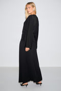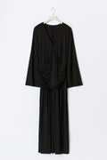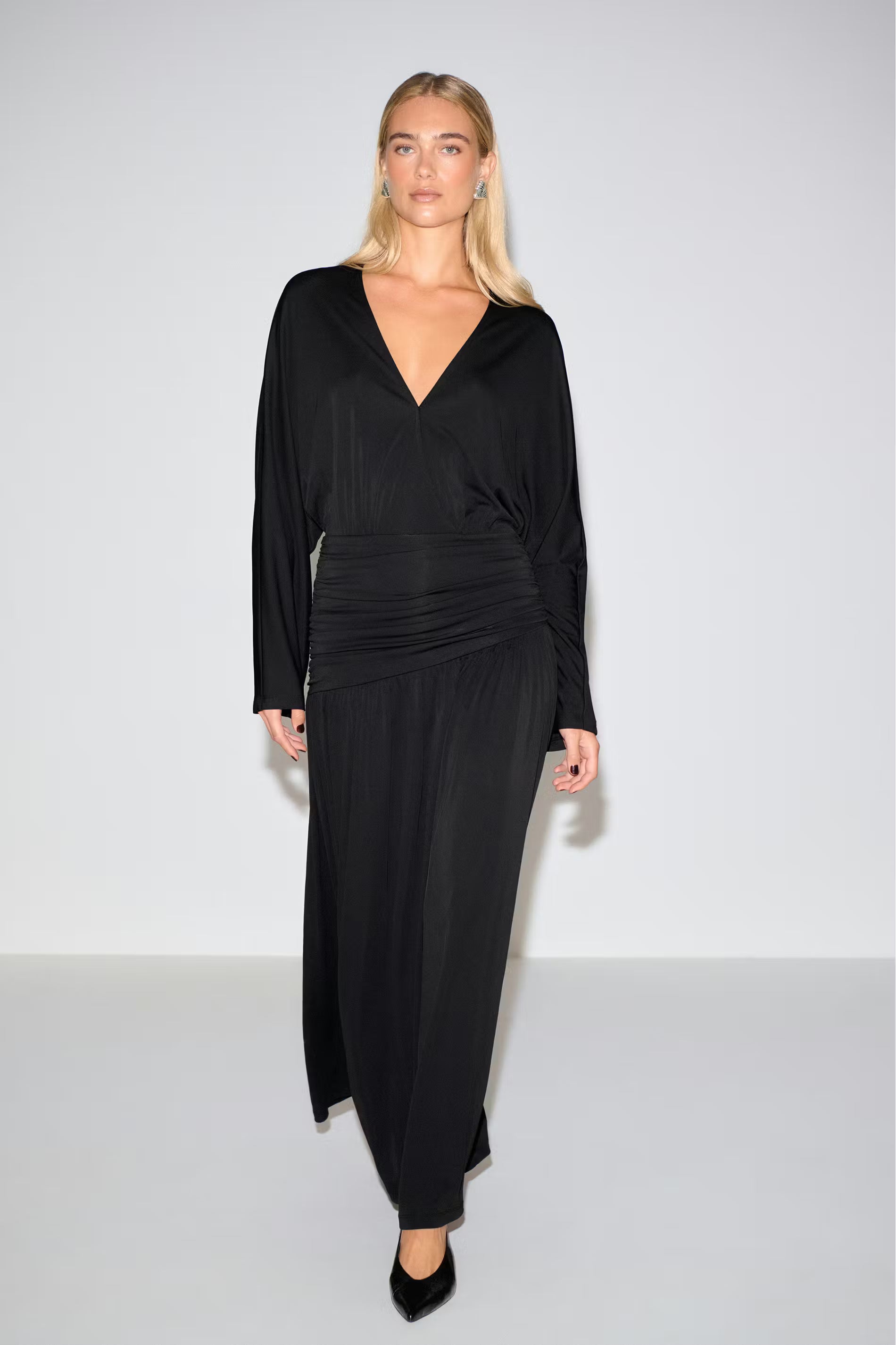 Robe longue avec effet froncé. La robe est noire et a une manche longue. Elle a une encolure en V et une élasticité.