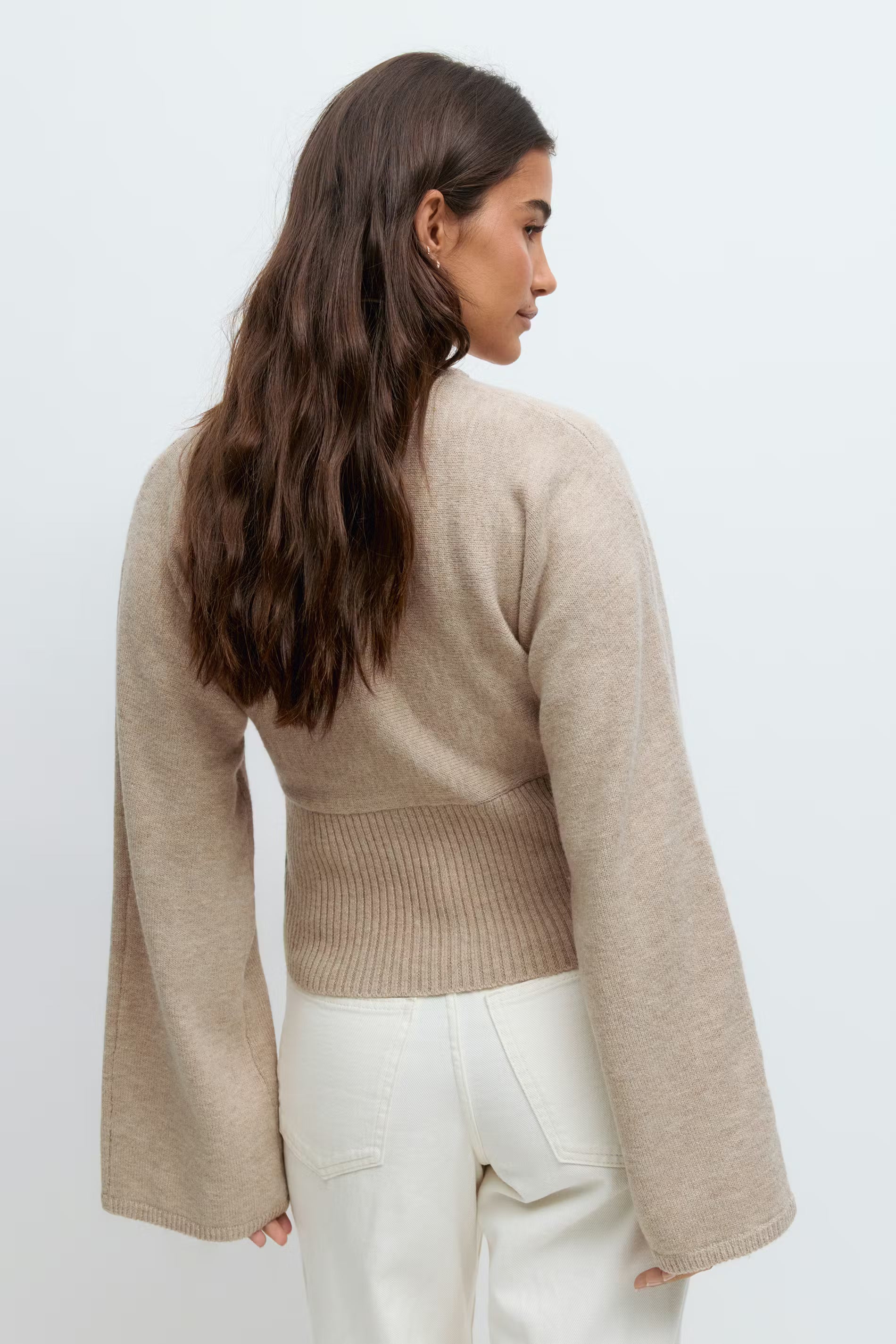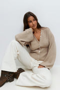 Cardigan tricoté avec col en V. Le gilet est beige et a des manches longues larges. Il a des boutons à l'avant et un revers côtelé sculptant et large en bas.