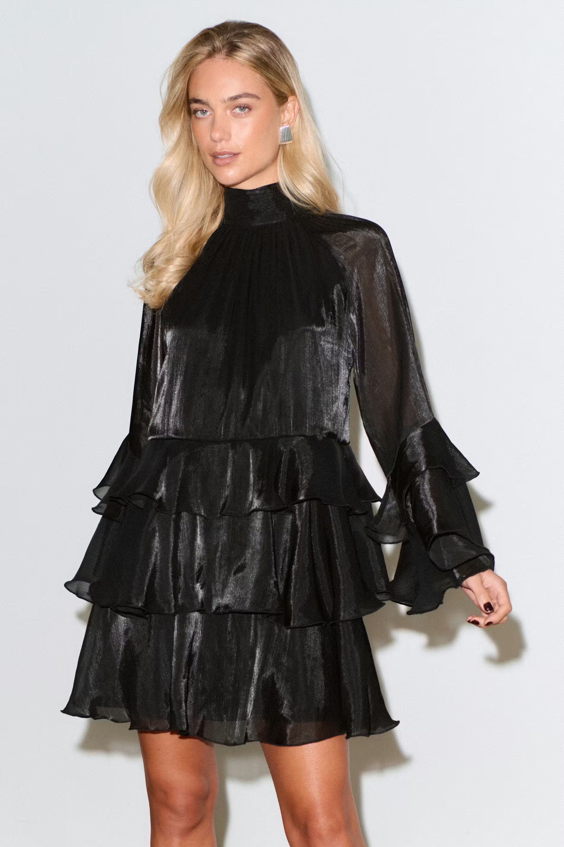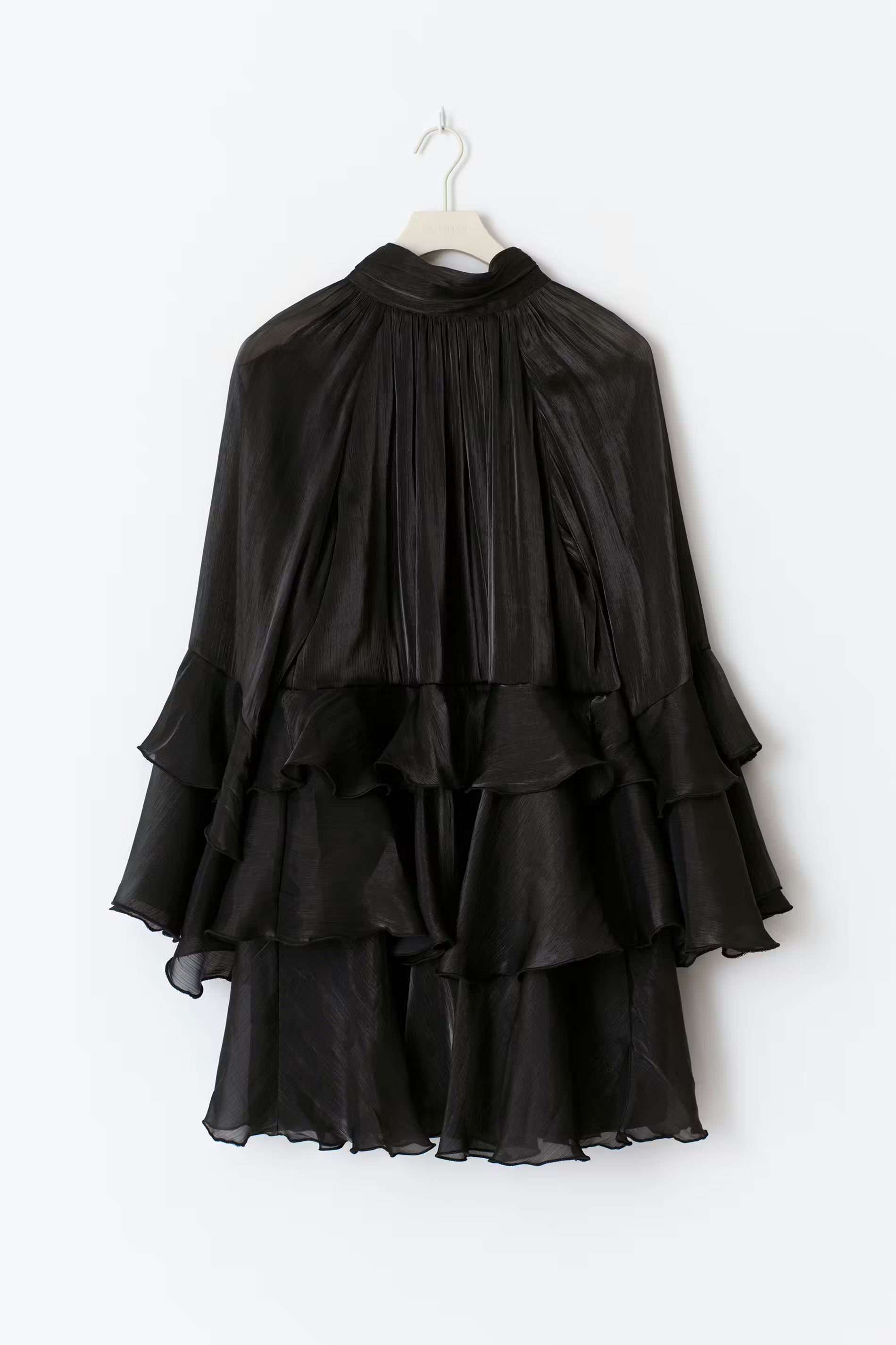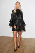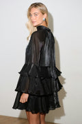 Robe courte avec manche longue. La robe est noire et a une structure brillante. Elle a volant à l'extrémité des manches et en bas, un col et une coupe régulière.