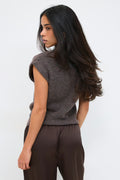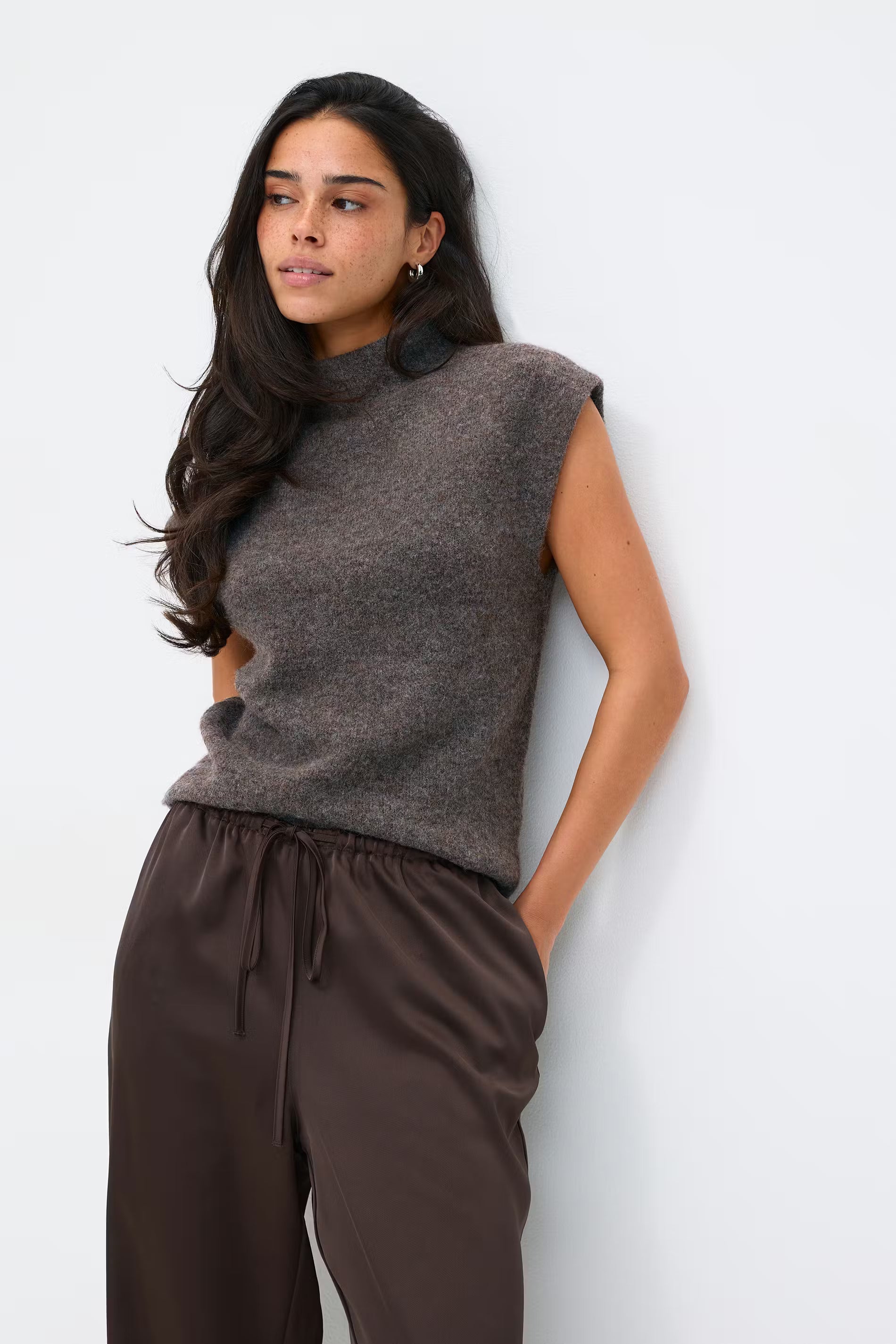Top tricoté en mélange de laine avec col haut. Le top est brun et a design sans manches. Il a coupe près du corps.