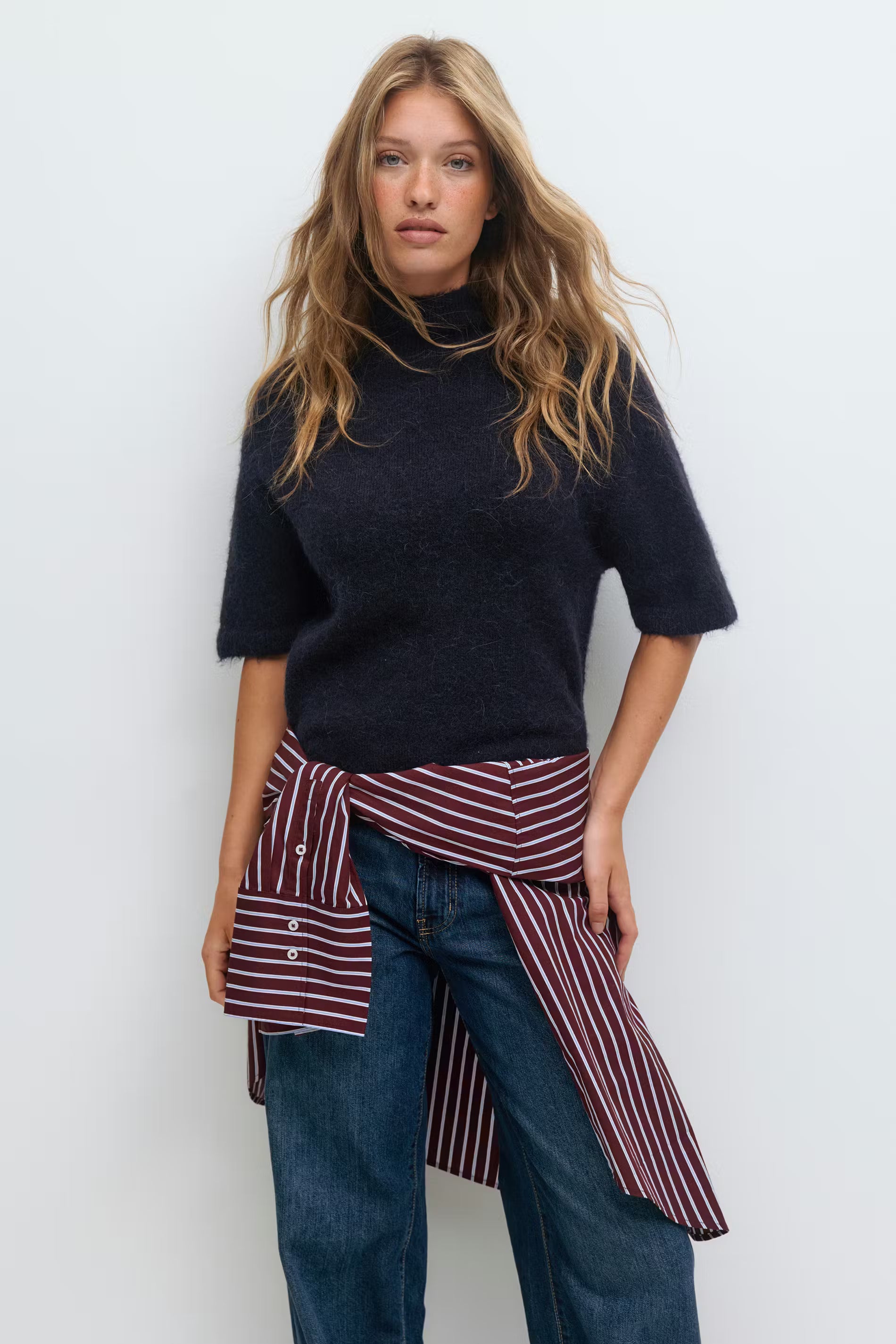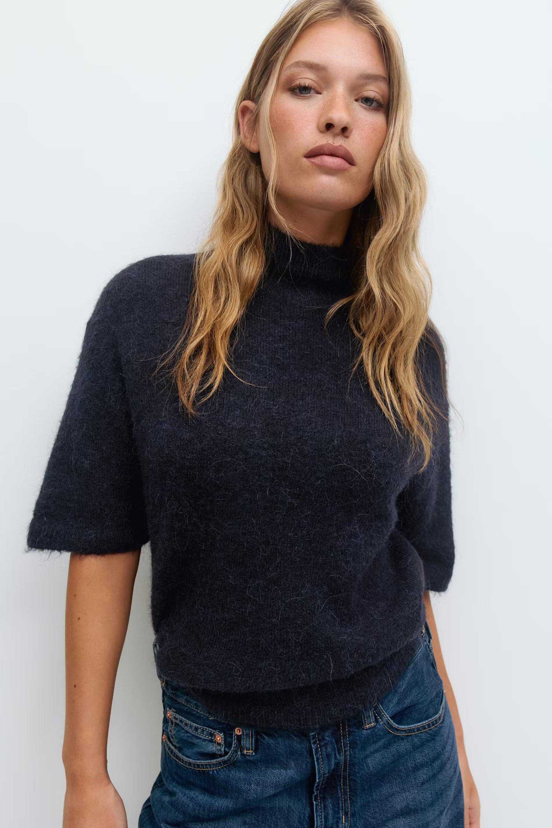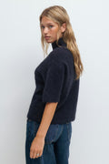 Tricot avec col montant. Le tricot est bleu marine et a des manches courtes.