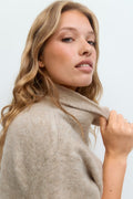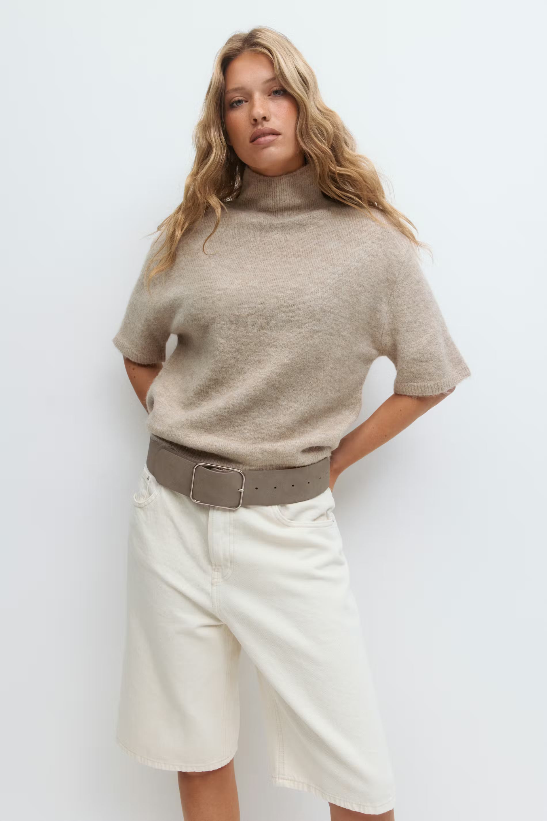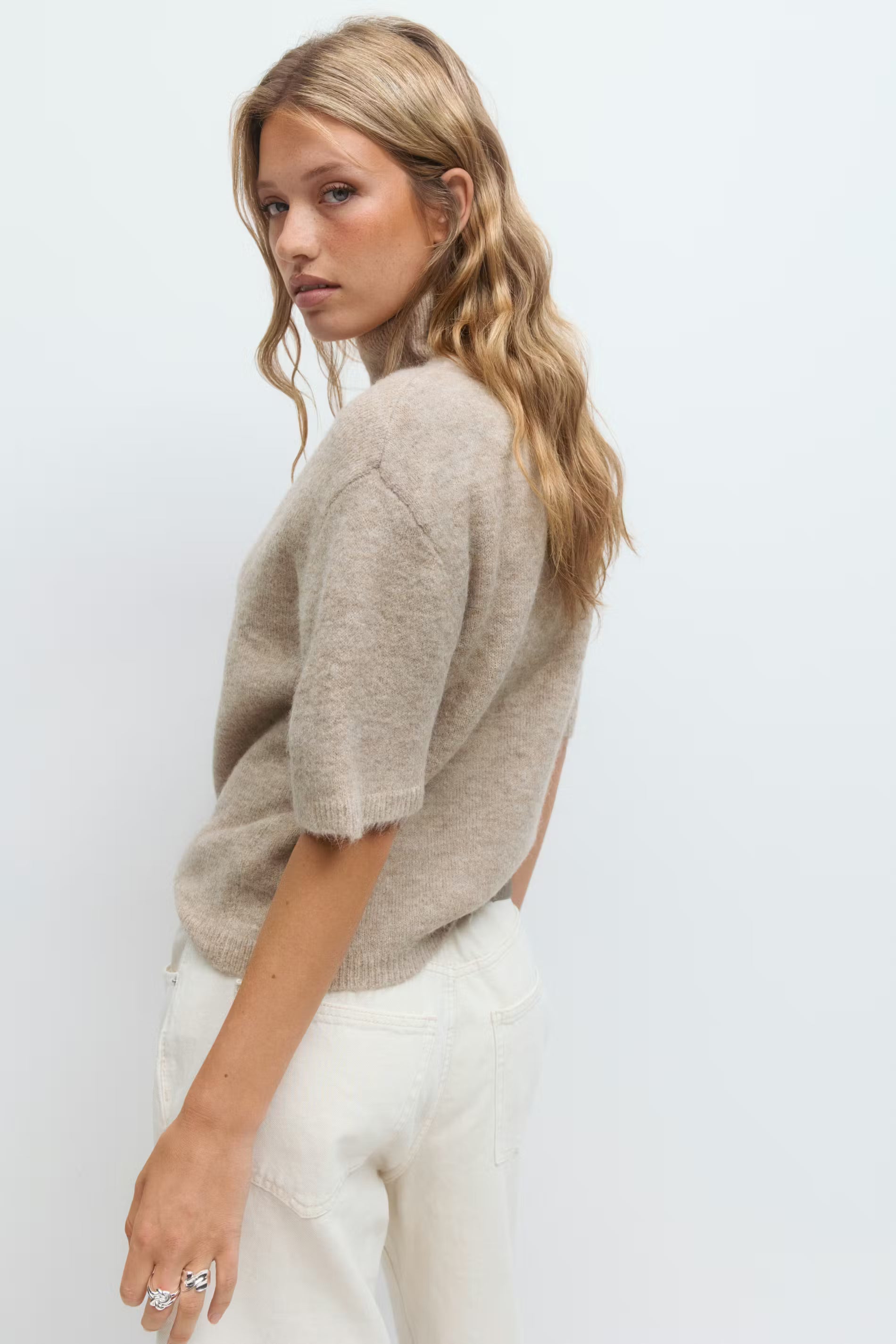 Tricot avec col montant. Le tricot est beige et a des manches courtes.