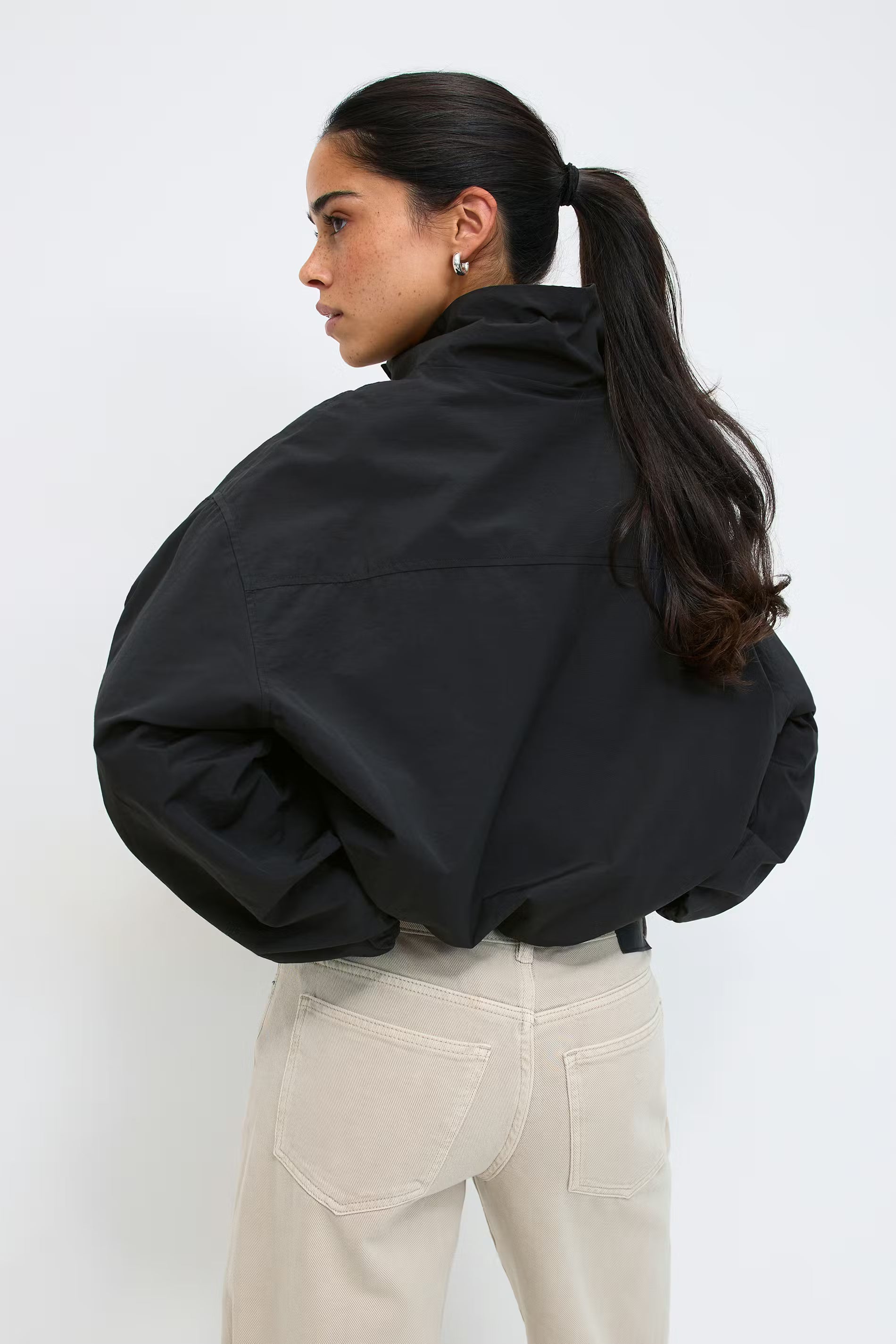 Veste courte avec col haut. La veste est noire et a fermeture éclair cachée à l'avant. Elle a coupe oversize, cordon élastique en bas et des poches sur les côtés. Entièrement doublée.