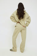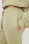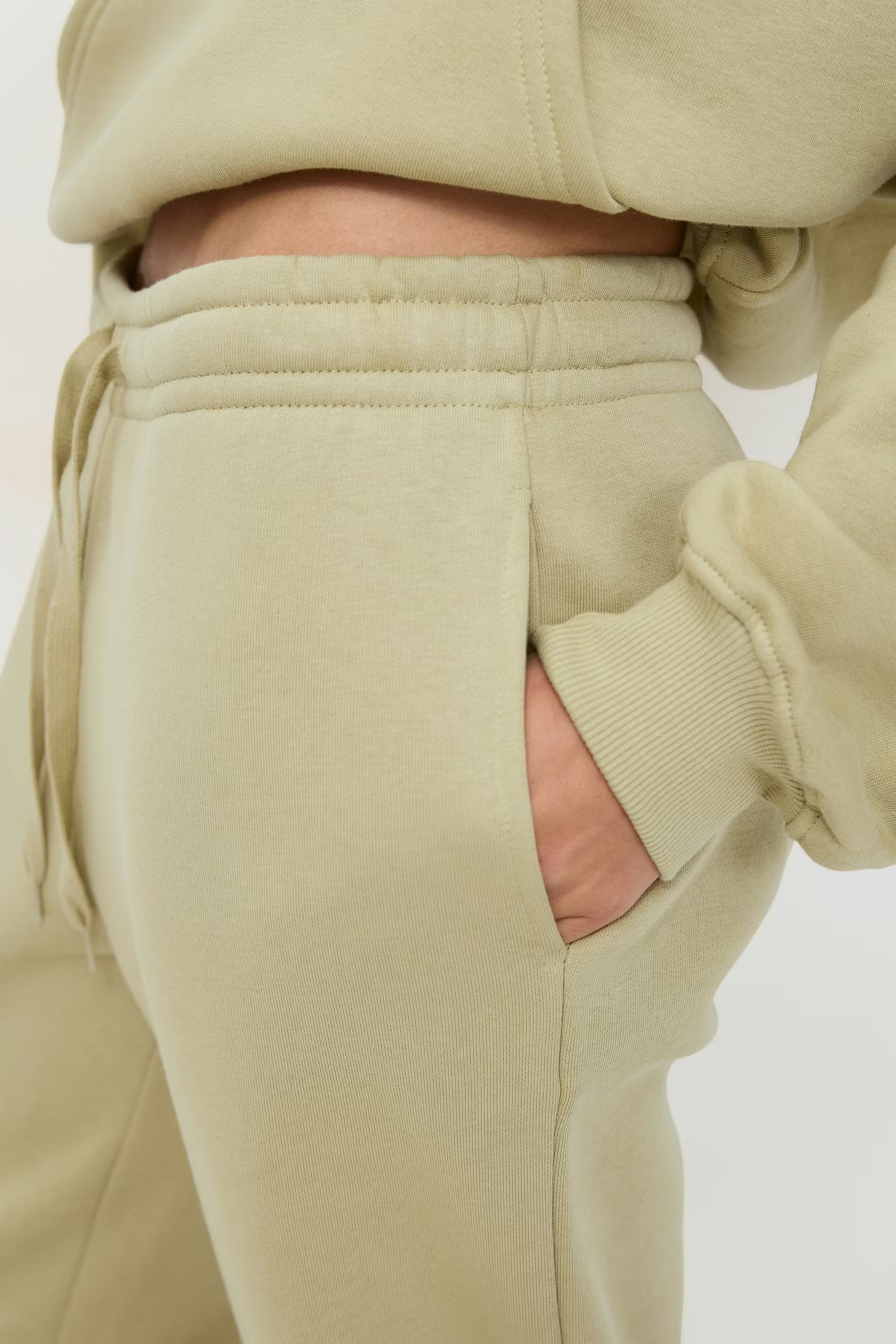 Pantalons de jogging avec poches sur les côtés. Les pantalons sont verts et ont coupe régulière. Ils ont des jambes droites et élastique à la taille avec ajustable à l'avant.