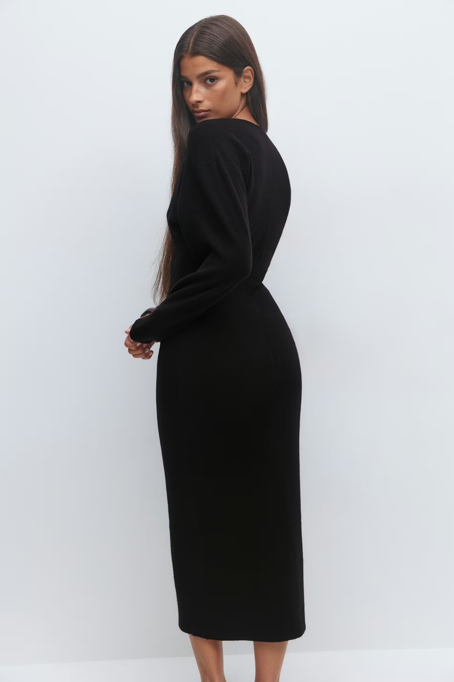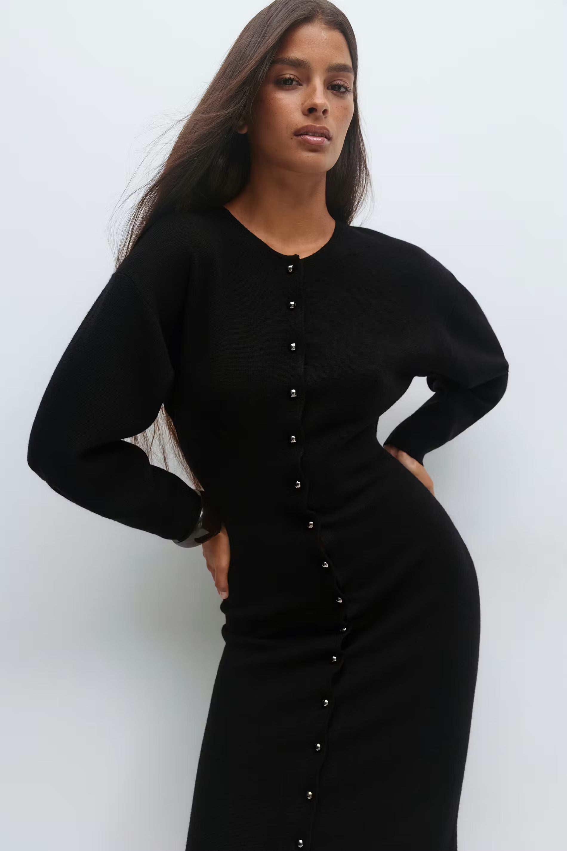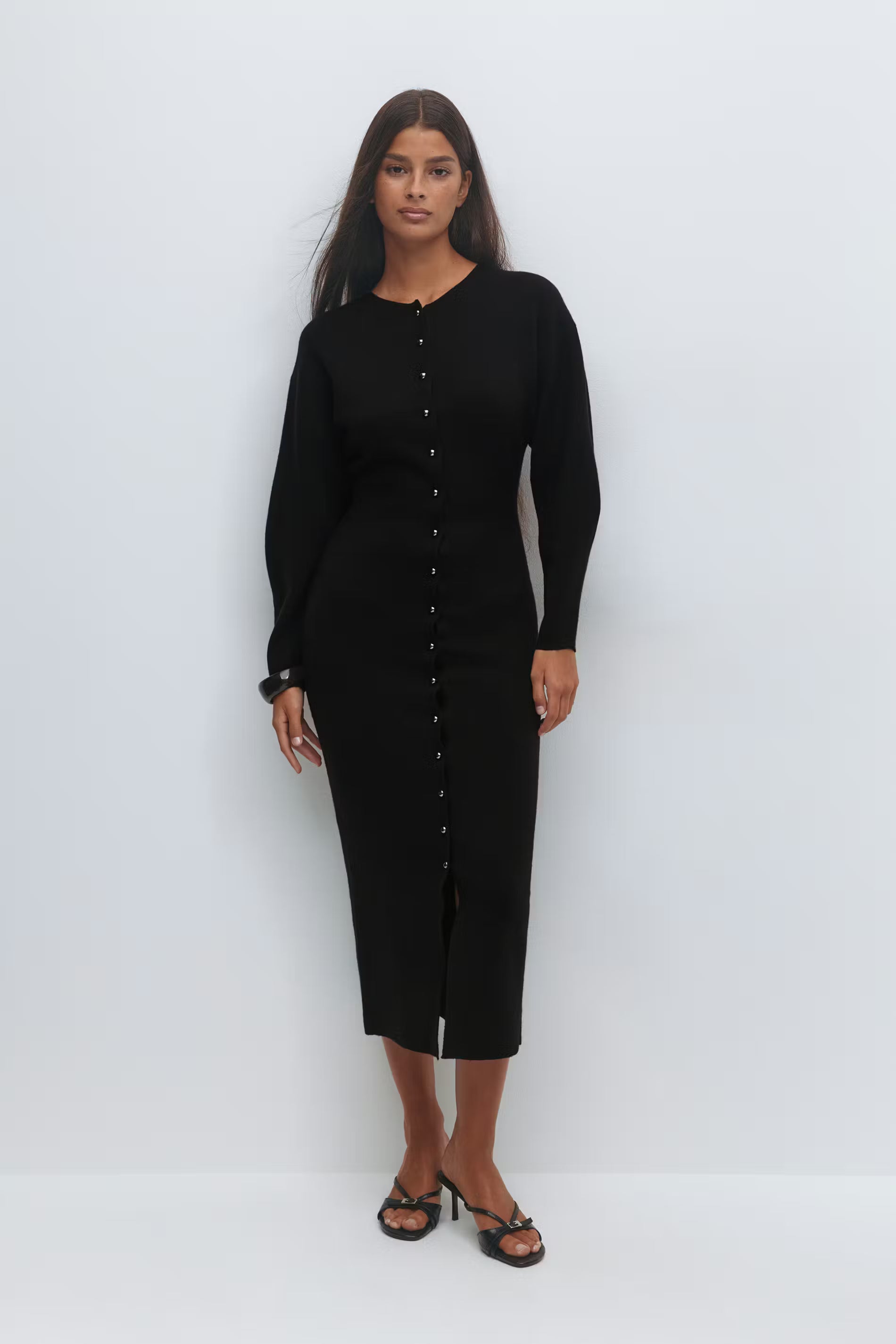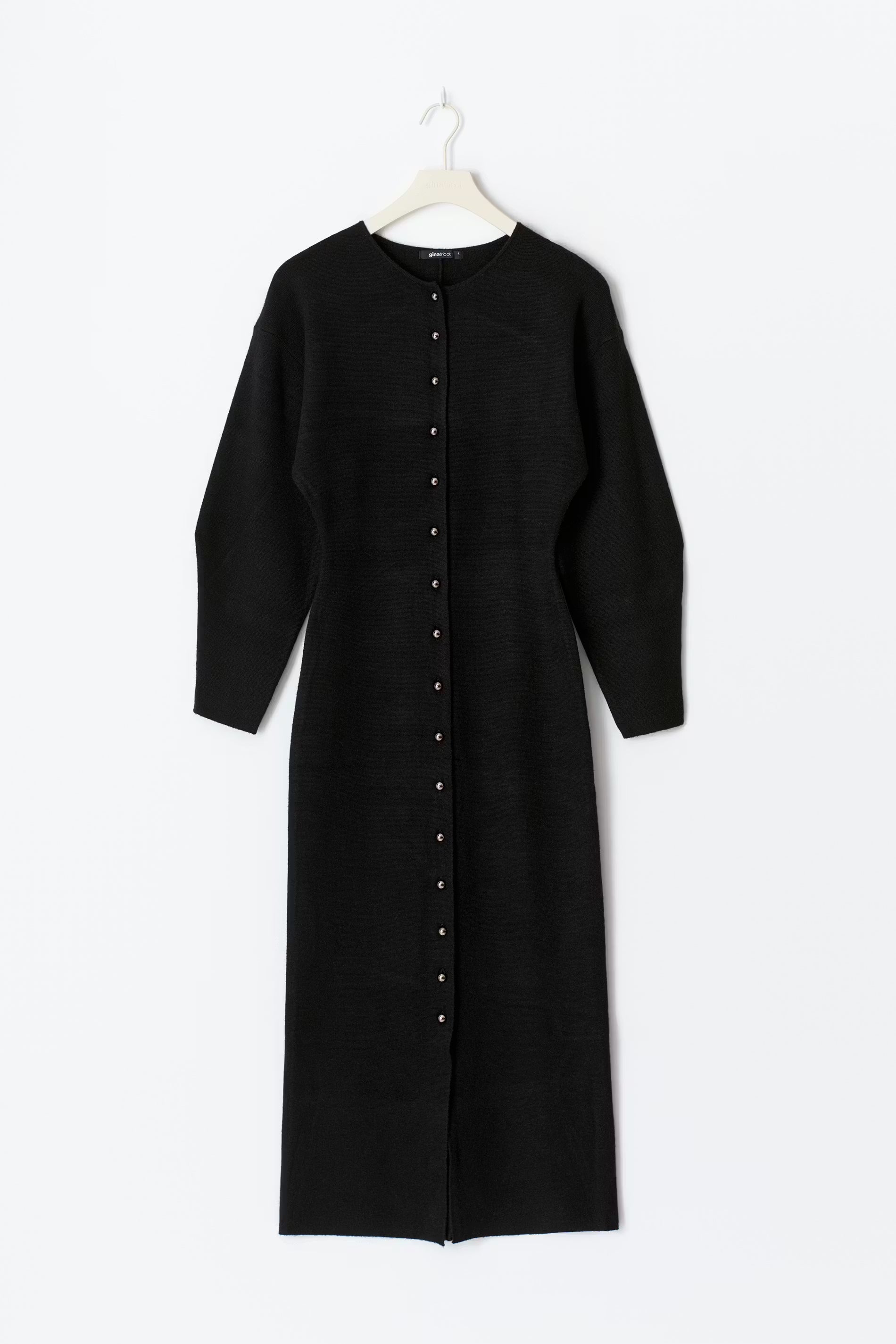 Longue robe en maille avec boutons à l'avant. La robe est noire et a col arrondi. Elle a taille ajustée, coupe près du corps et des manches longues.