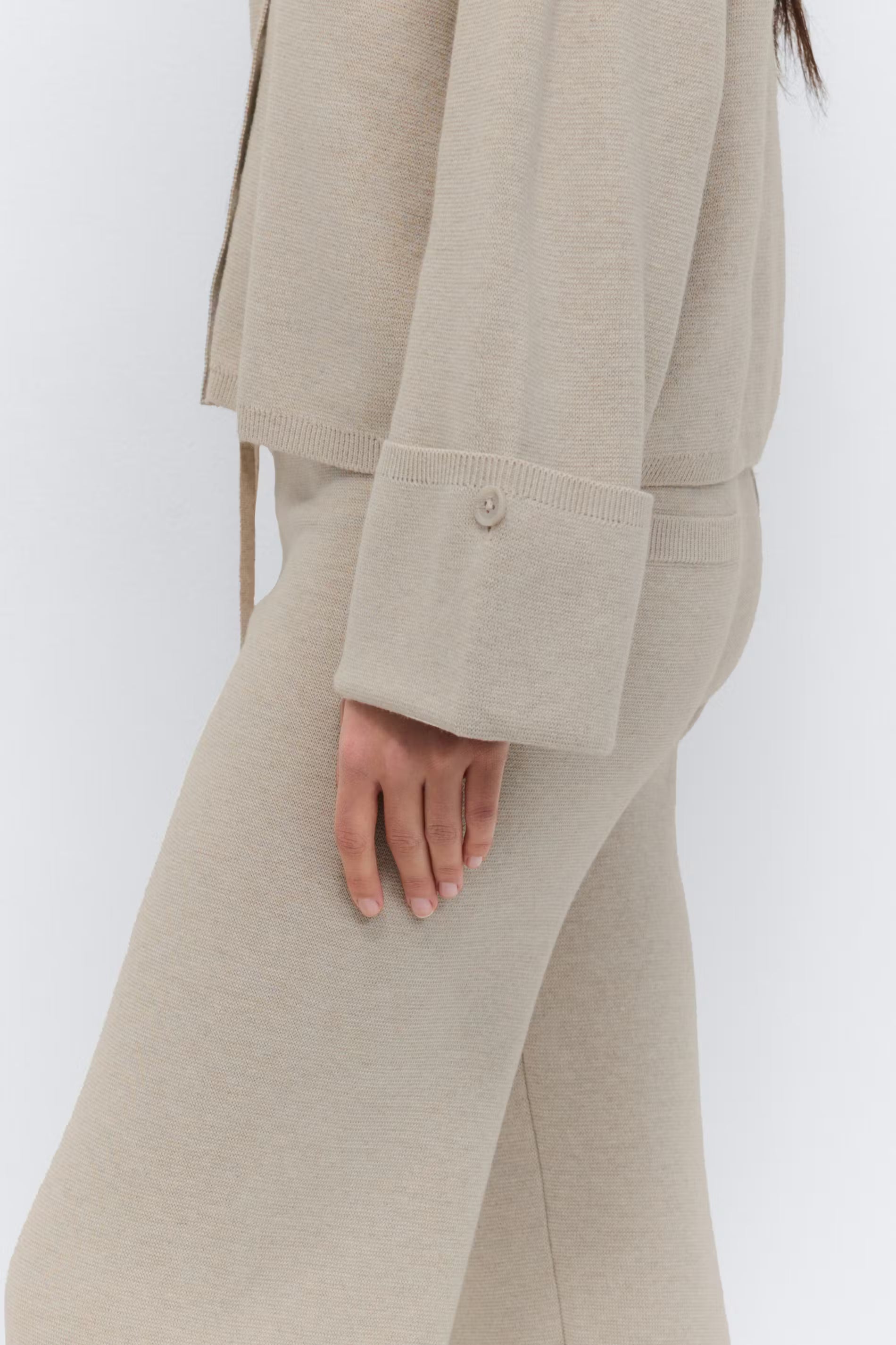 Cardigan tricoté avec boutons à l'avant. Le gilet est beige et a des manches repliées avec bouton. Il a des épaules tombantes, col arrondi et tricot à côtes en bas.