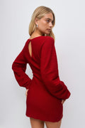 Robe en maille courte avec effet nervuré. La robe est rouge et a une longue manche. Elle a un col arrondi, une coupe près du corps et une fermeture de serrure à l'arrière.