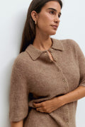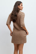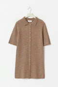 Robe en maille courte avec manches trois quarts. La robe est beige foncé et a des boutons à l'avant. Elle a un col arrondi avec col.