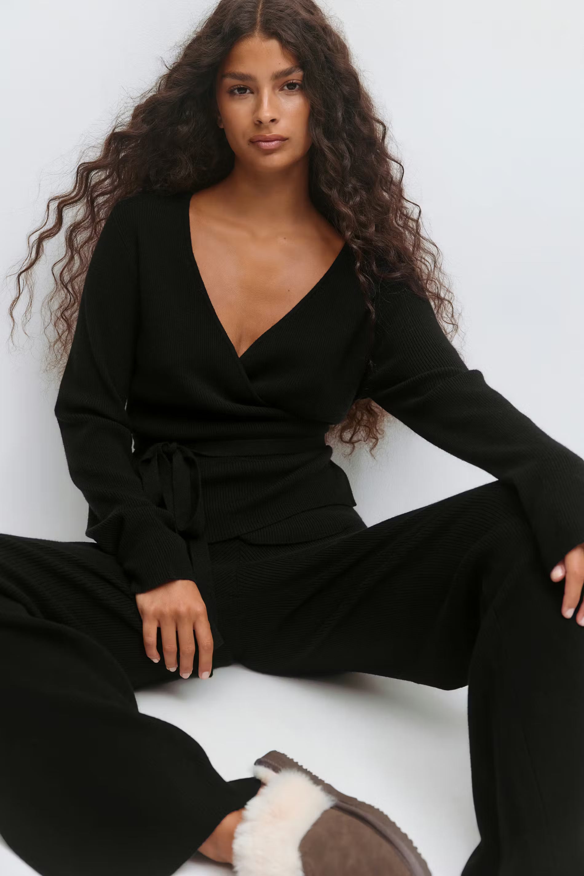 Cardigan cache-cœur avec coupe en V. Le cardigan est noir et a des manches longues. Il a un ajustable à la taille et une coupe régulière.