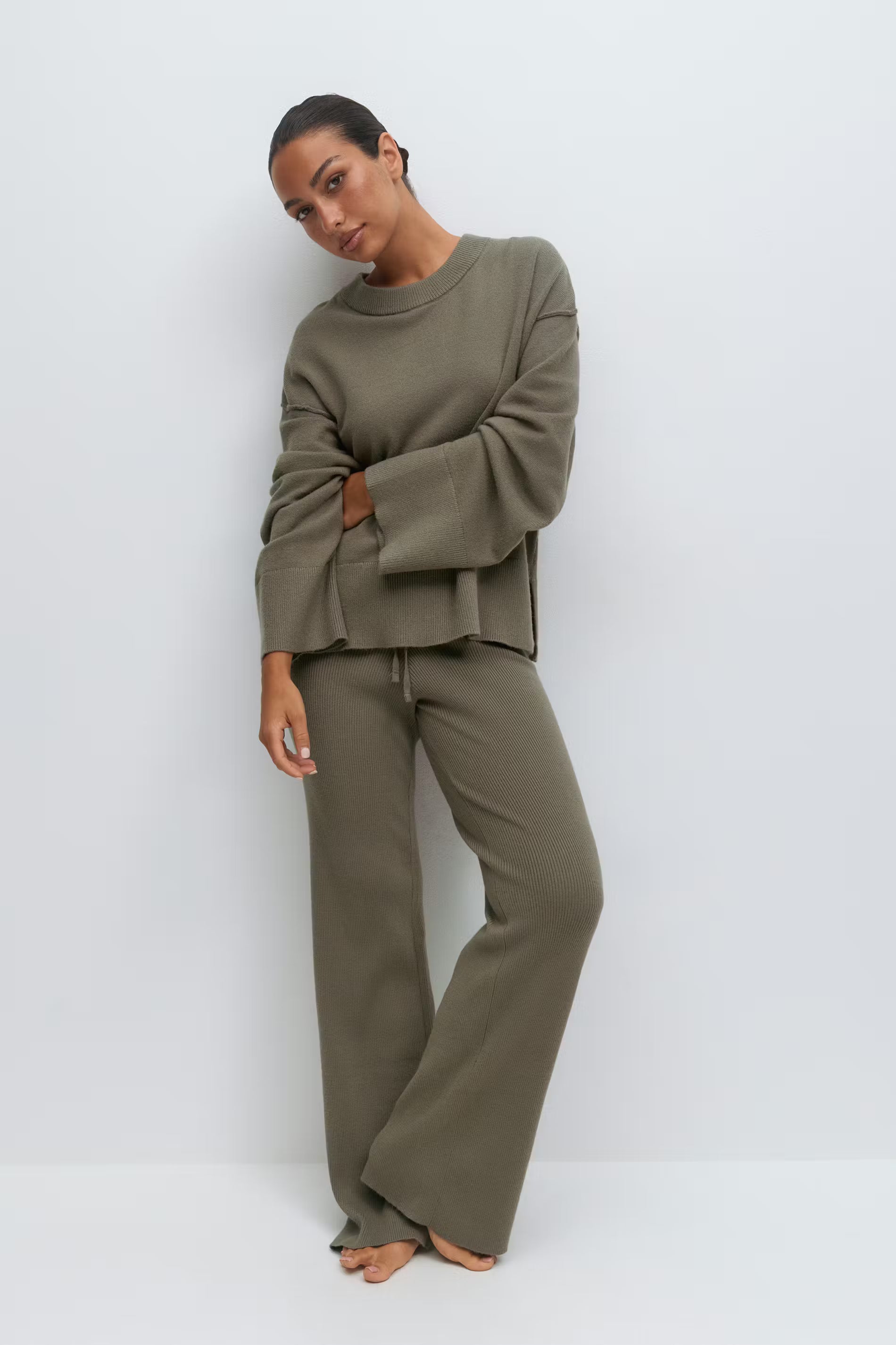 Tricot avec coupe oversize. Le tricot est vert et a des manches longues avec épaules tombantes. Il a un col arrondi et des fentes sur les côtés.