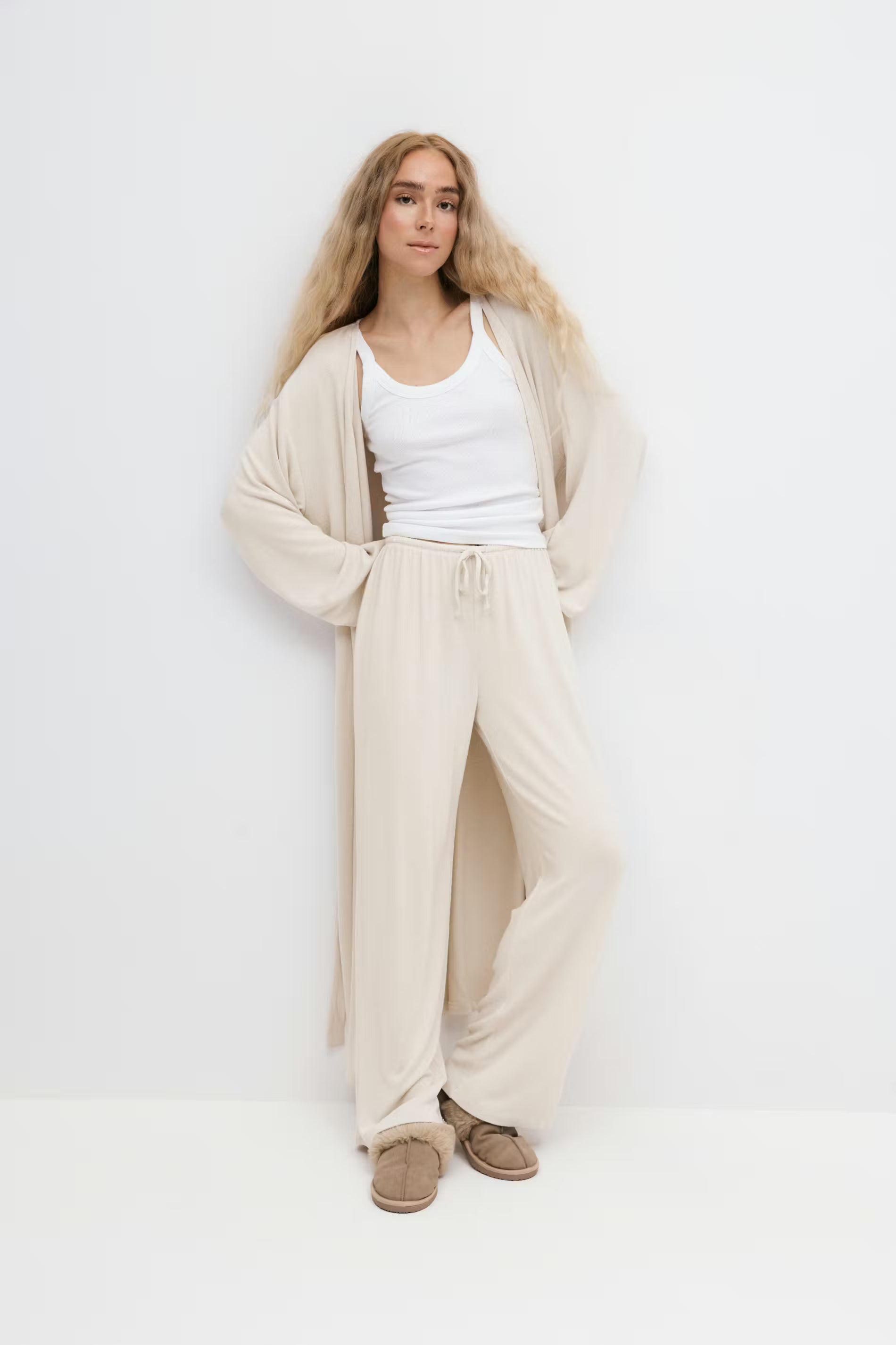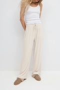 Pantalon large avec ajustable à la taille. Les pantalons sont beiges et ont une coupe oversize. Ils ont taille mi-haute et des jambes avec longueur complète.