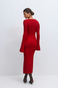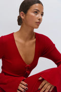 Robe en maille à nervures avec longues manches lanternes. La robe est rouge et a une coupe près du corps. Elle a une longueur midi, une encolure en V et des détails en perle à l'avant.