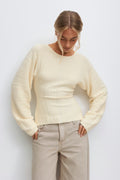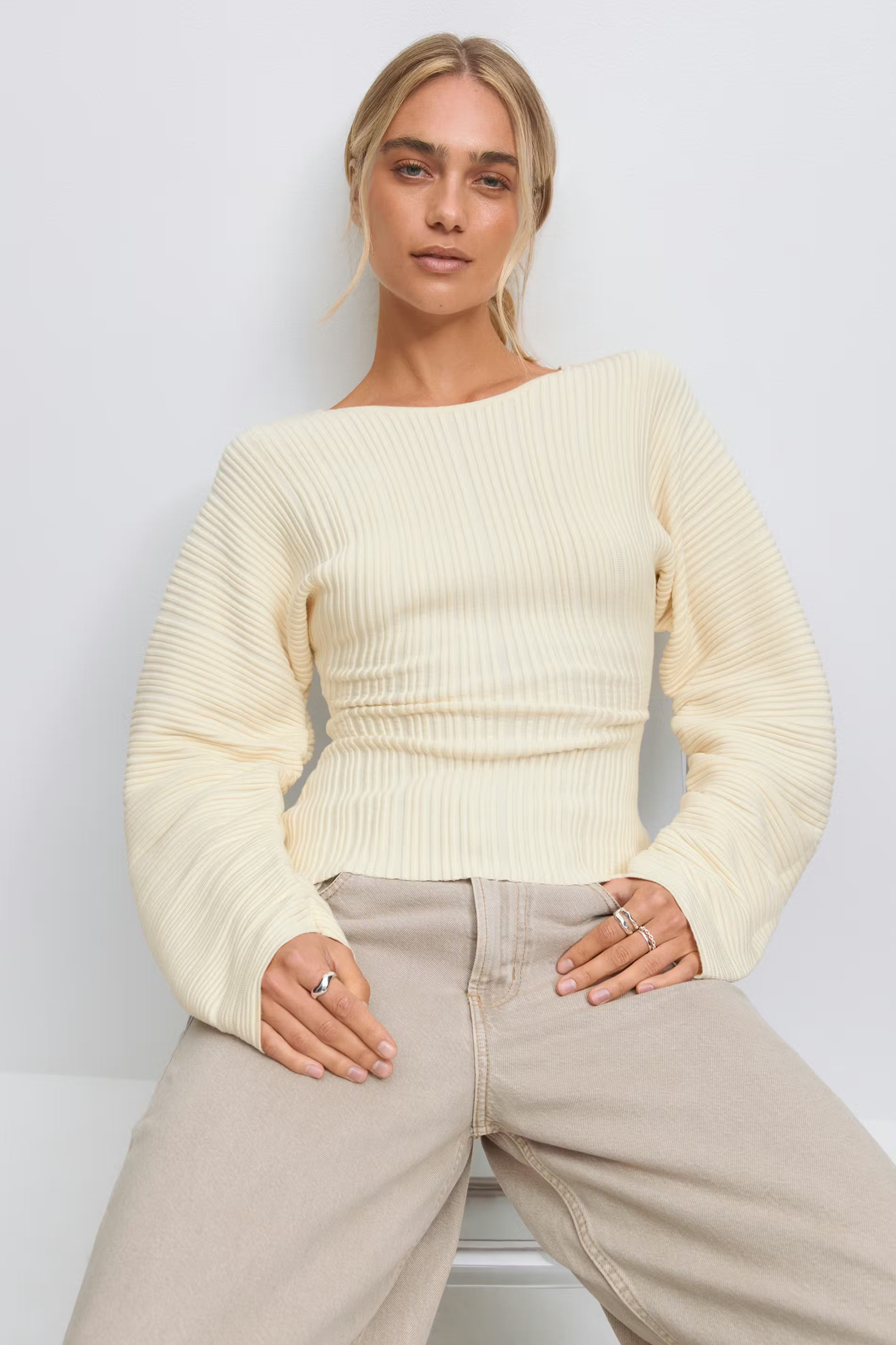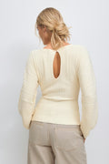 Top tricoté avec manche longue et arrondie. Le top est crème et a une matière à nervures. Il a un boutonnage à l'arrière, un col arrondi et une coupe régulière.