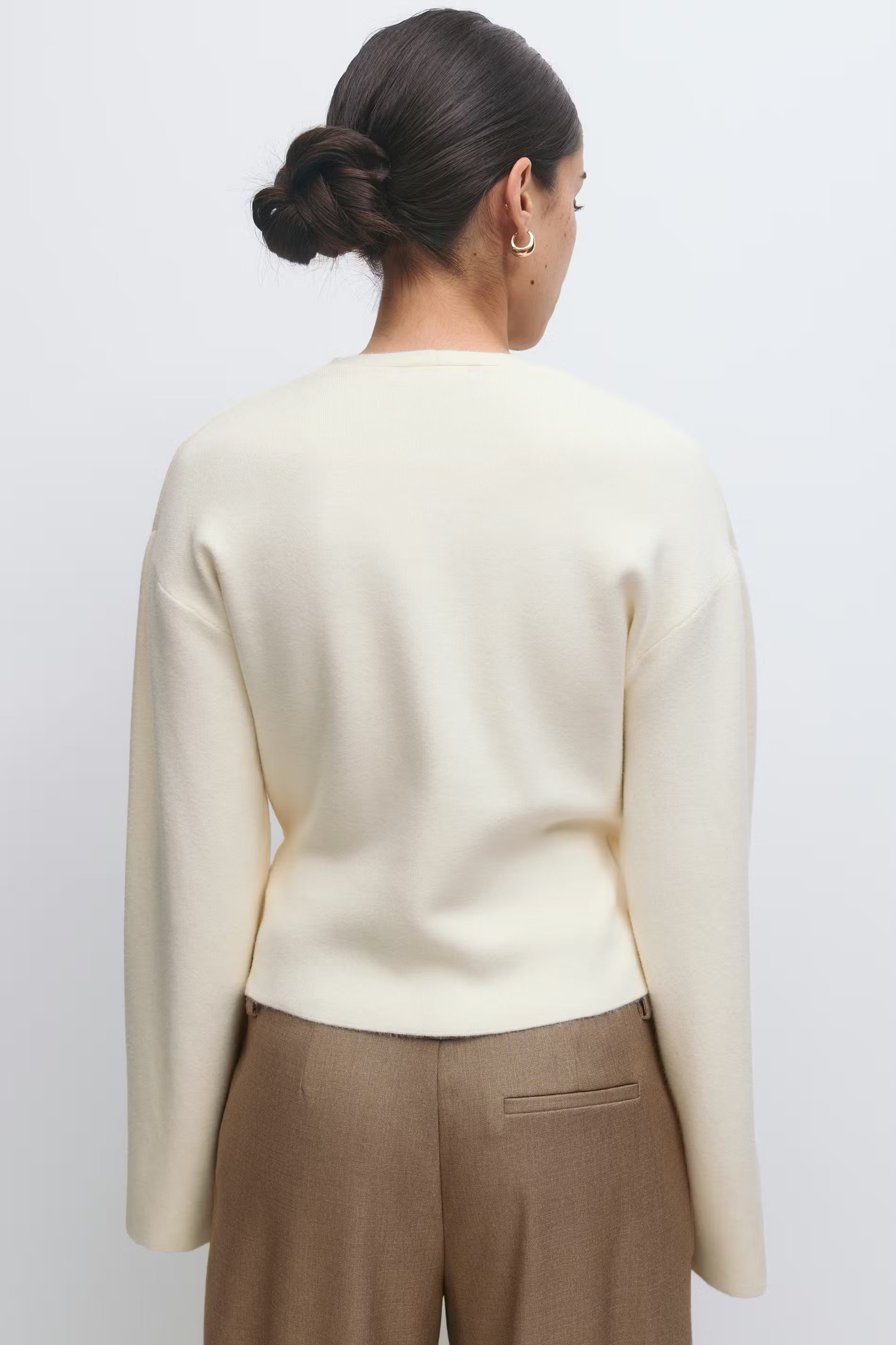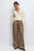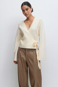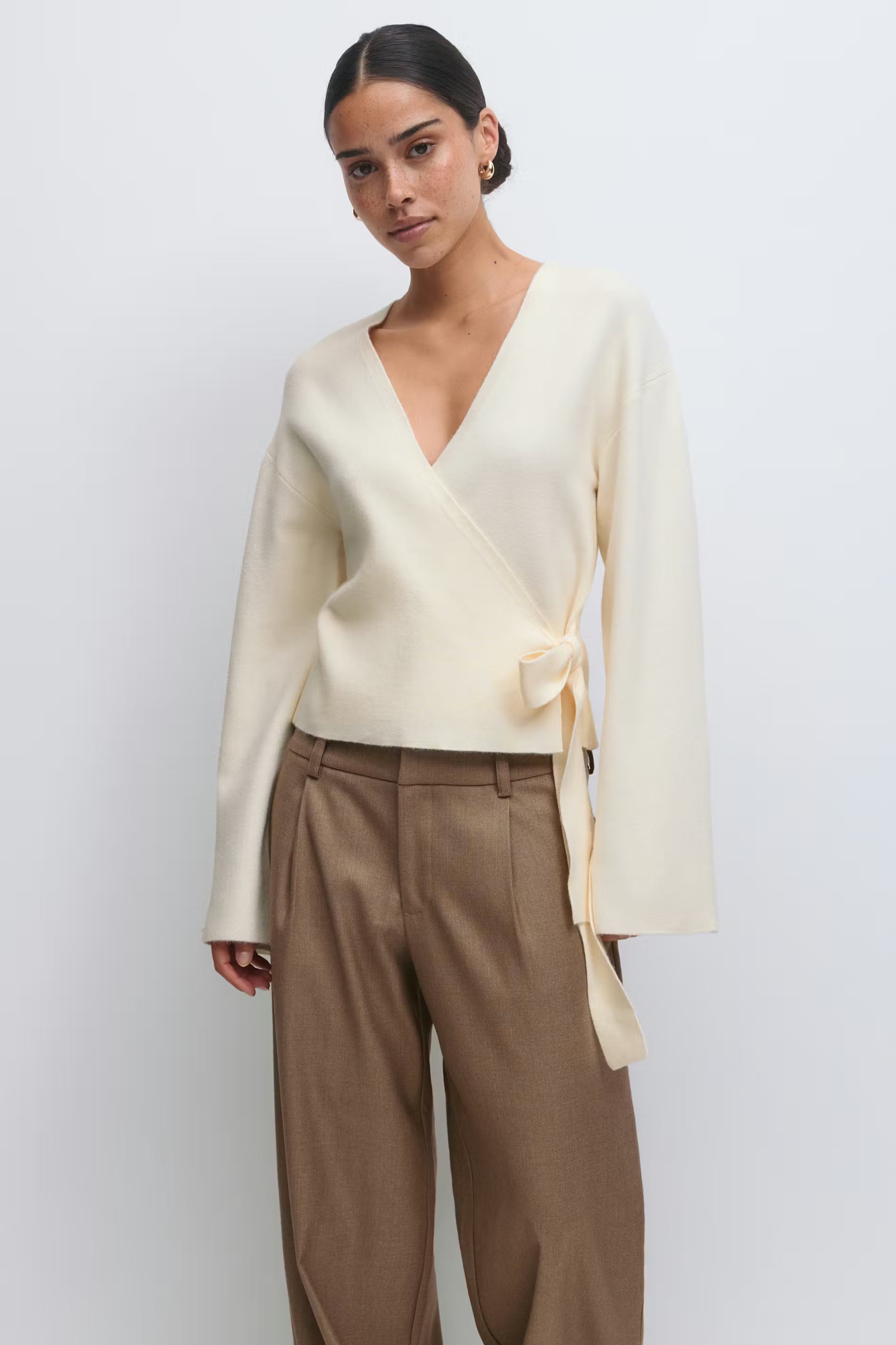 Cardigan cache-cœur avec col en V. Le cardigan est blanc cassé et a un ajustable à la taille. Il a une manche longue et une coupe régulière.