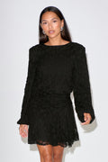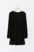 Robe courte en dentelle avec manche longue. La robe est noire et a un style ample. Elle a un ras-du-cou.