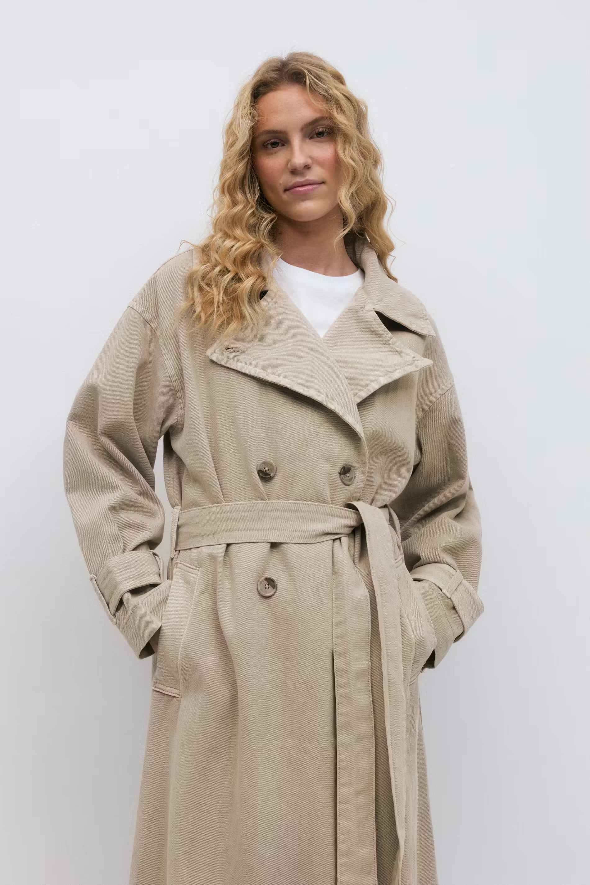 Long trench en denim avec ceinture ajustable à la taille. Le manteau est beige et a coupe oversize. Il a fermeture à double bouton, col à revers, des poches sur les côtés, manche longue, attache ajustable aux extrémités des manches et empiècement lâche à l'arrière.