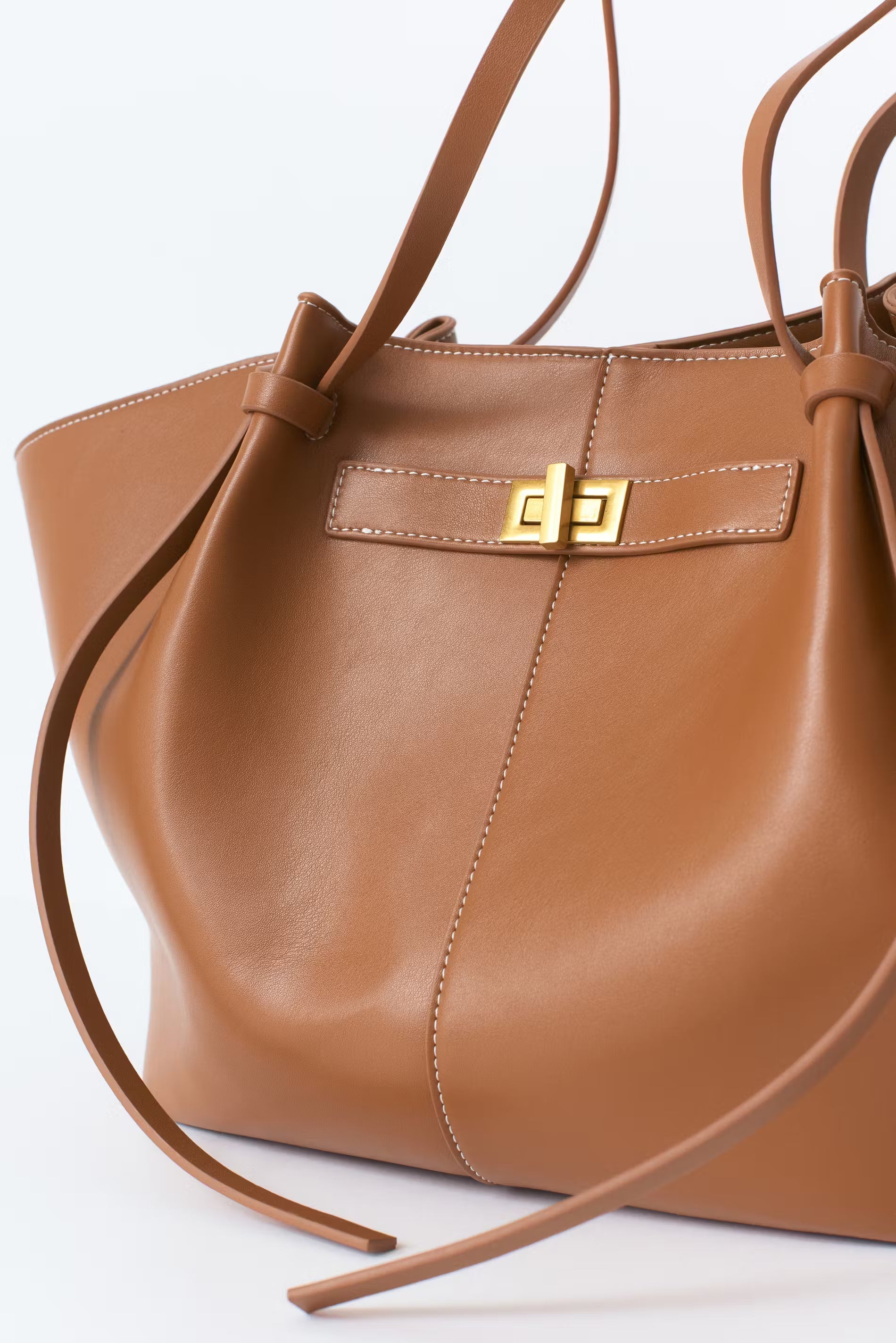 Grand sac en imitation cuir avec doubles poignées. Le sac est beige et a boucle dorée. Il a fermeture aimantée et compartiment intérieur.