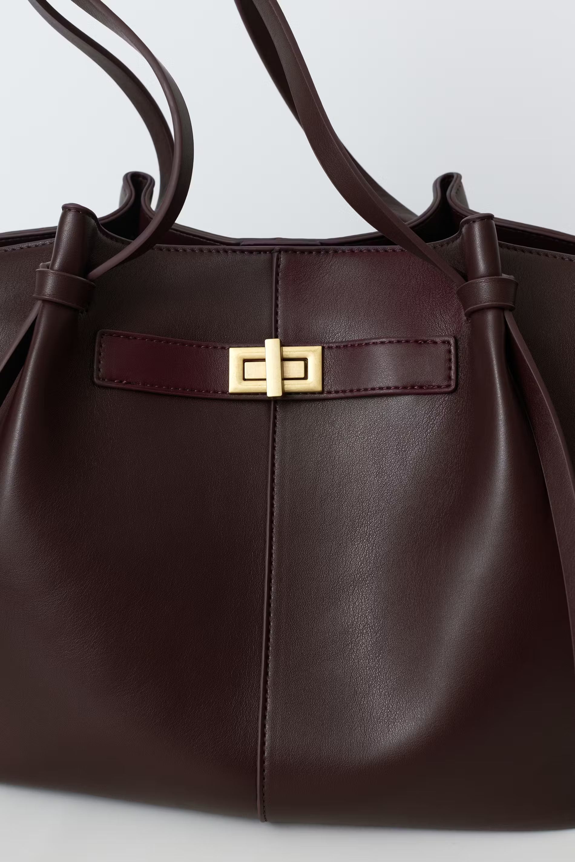 Grand sac en imitation cuir avec doubles poignées. Le sac est beige et a boucle dorée. Il a fermeture aimantée et compartiment intérieur.