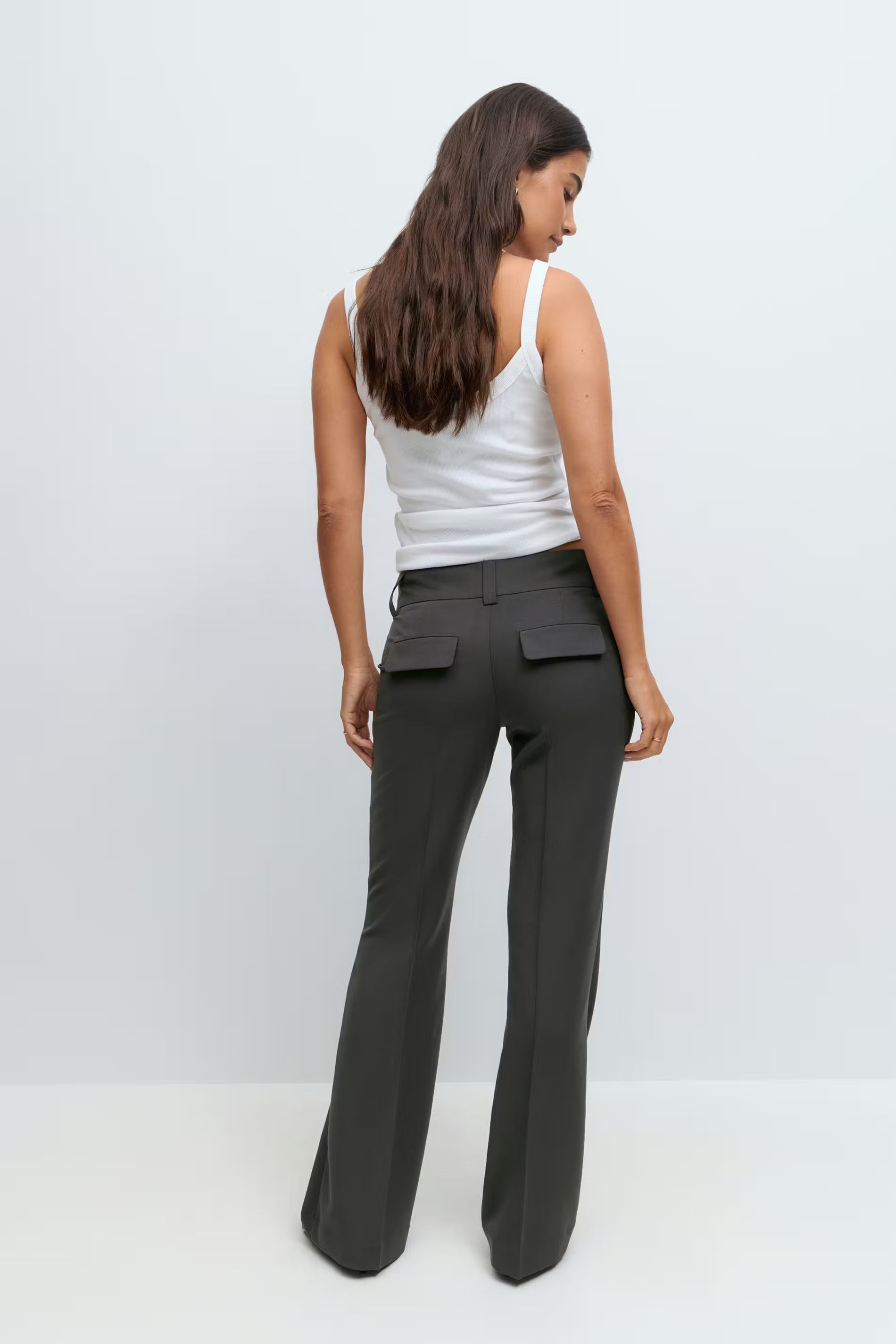 Pantalons habillés taille basse avec jambes évasées. Les pantalons sont gris et ont une poche à rabat dans le dos. Ils ont une couture décorative à l'avant et une coupe près du corps.