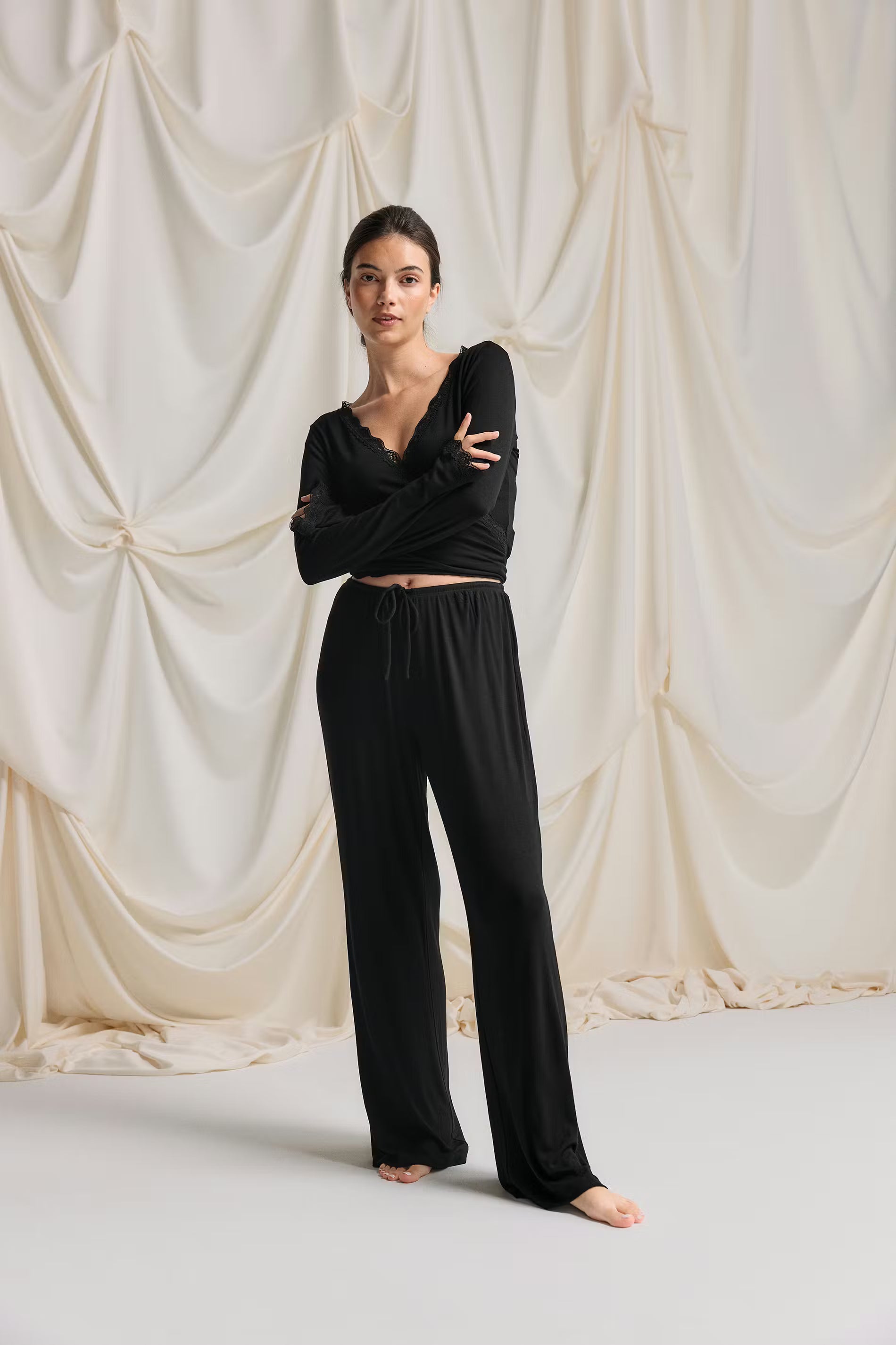 Pantalons d'intérieur avec qualité douce. Les pantalons sont noirs et ont taille basse. Ils ont coupe régulière, ajustable à l'avant, des jambes droites avec longueur complète et élastique à la taille.