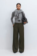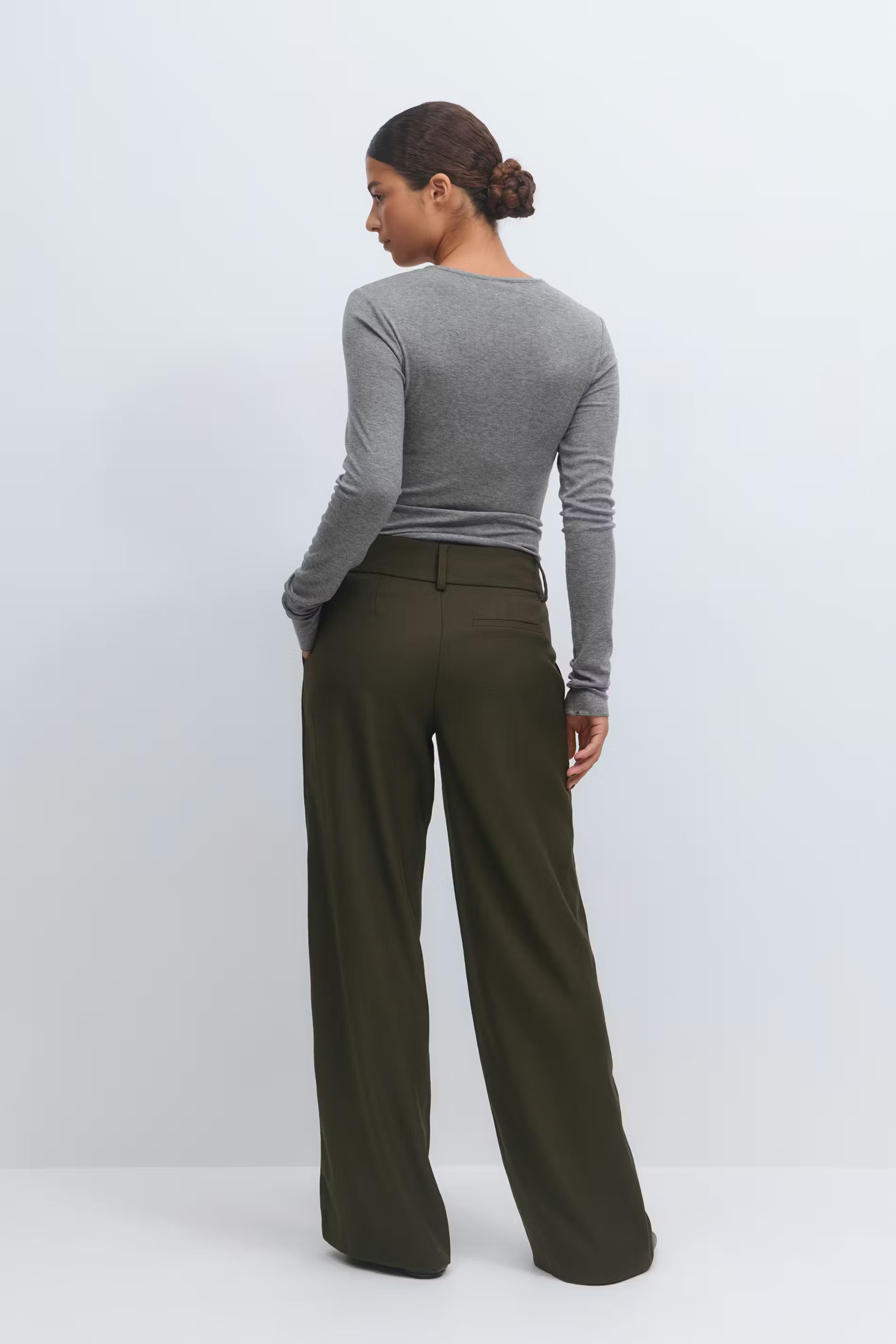 Pantalons de costume taille basse avec poches sur les côtés. Les pantalons sont vert foncé et ont des jambes larges avec longueur normale. Ils ont pli à l'avant, crochet et oeillet de fermeture, braguette, des boucles de ceinture et poche arrière.