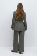 Pantalons de costume à chevrons avec plis à l'avant. Les pantalons sont gris et ont des jambes larges avec longueur normale. Ils ont crochet et oeillet de fermeture, des poches sur les côtés, taille mi-haute, braguette et des boucles de ceinture.