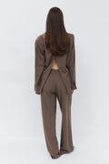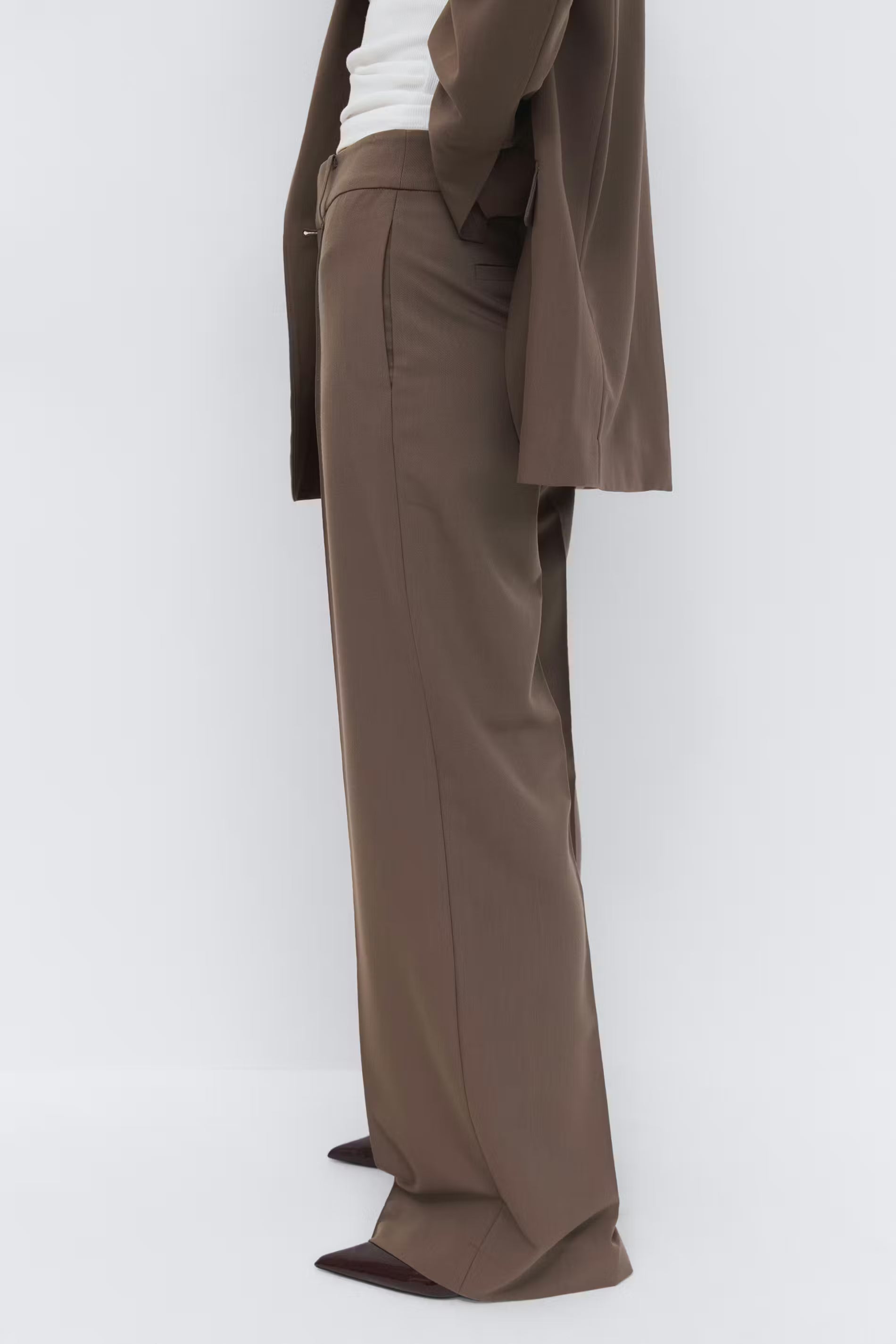 Pantalons de costume larges avec plis. Les pantalons sont bruns et ont taille mi-haute. Ils ont des jambes larges avec longueur complète, crochet et oeillet de fermeture, des boucles de ceinture et des poches sur les côtés.